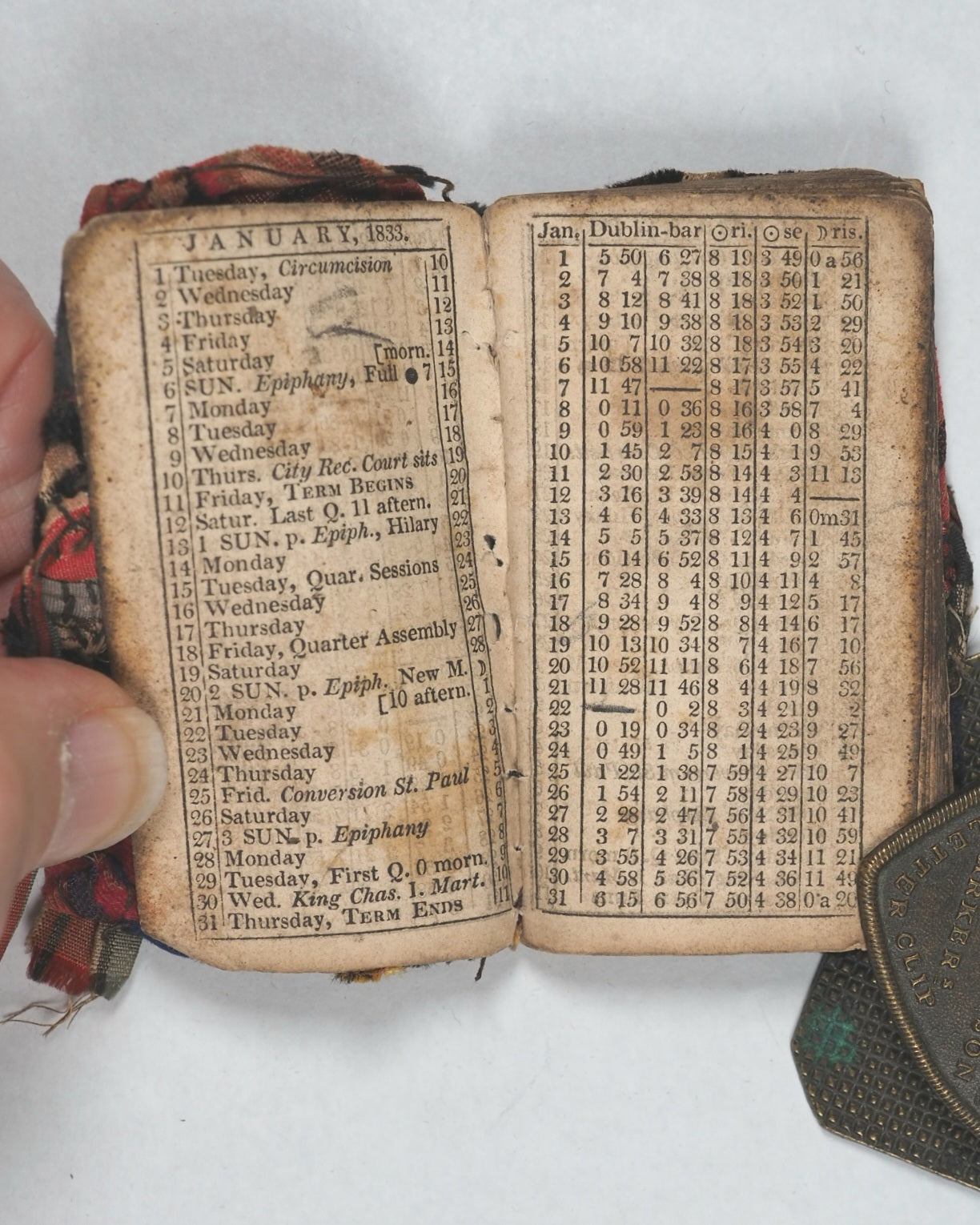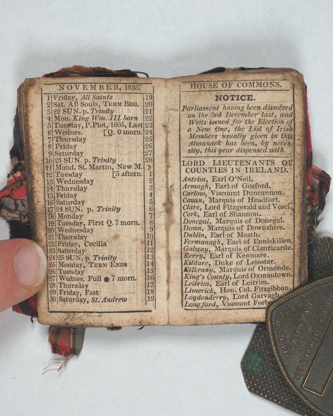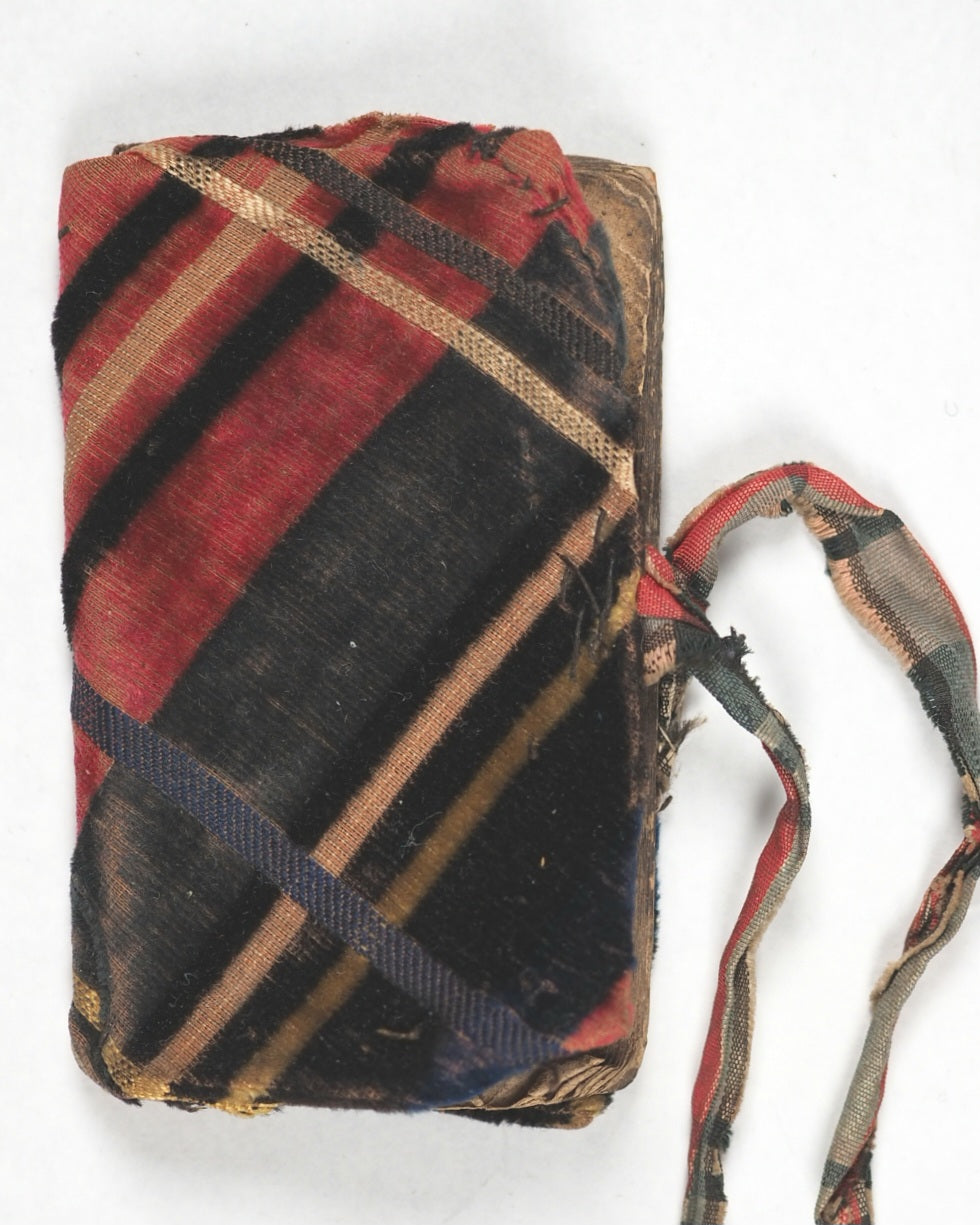 22 printed pages. Pre-dates Dublin almanac and general register of Ireland published by Pettigrew and Oulton, Dublin, 1833-1848. No title page or printer, and missing December leaf. Edges smoke stained and corners worn. Age-toning and mild spotting. Some contemporary ink and pencil inscriptions on endpapers, in 'Bangor' and dated 1844. 40 x 70 mm. Original card covers complete with contemporary tartan velvet jacket with tartan silk ties. Rather worn and colours slightly faded. Unrecorded. WorldCat locates no copies worldwide. The usual list of Irish Members of Parliament in this almanac is absent due to its dissolution and the impending elections - the 1832 general election marked a pivotal moment for Irish nationalism. Bangor voted for a Whig M.P. The almanac includes eclipses, lists of prominent residents, costs of transport by coach, a list of post-towns where carriages stopped, and a table of wages - from a minimum of 1s. and 8d. up to £1/5s. per month. These types of publications were often seen as "throwaway" items, intended for immediate practical use, which makes surviving copies relatively rare and interesting despite any defects. The contemporary vernacular tartan binding is also remarkable and highly collectable.