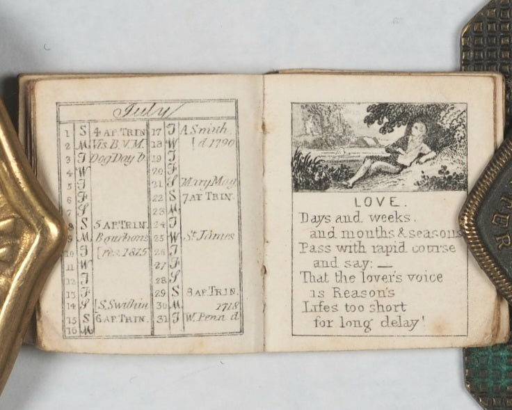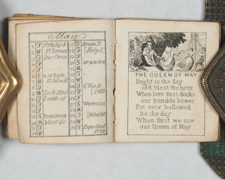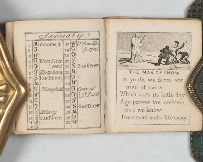 64 pages. Engraved frontispiece and title vignette, twelve finely engraved monthly vignettes consisting of pastimes and activities. Engraved throughout on verso only. Compares favourably with earlier Schloss almanacs. All edges gilt. Original cream endpapers. No inscriptions. 25 x 30 mm. Publisher's black morocco (limp), gilt stamped "bijou Almanac 1855" within decorative gilt tulip frame and border, on front cover. Spine worn and largely missing. Bondy, 44. Not in Spielmann. Welsh, 1263. OCLC, 1122791366. WorldCat locates one single copy worldwide (University Library of Virginia). The Bijou Almanac for 1855, published by Rock Brothers & Co. in London in 1854, was not just for checking the date; it was a fashionable accessory for ladies and a popular gift - a prime example of mid-Victorian miniature book publishing,they were collectively often referred to as "Victorian Kindles" due to their portability and curated content. While earlier, more famous versions were published by Albert Schloss (1836–1843), Rock Brothers & Payne continued this tradition of producing exceptionally small, engraved, and decorative almanacs for the handbag or waist pocket.