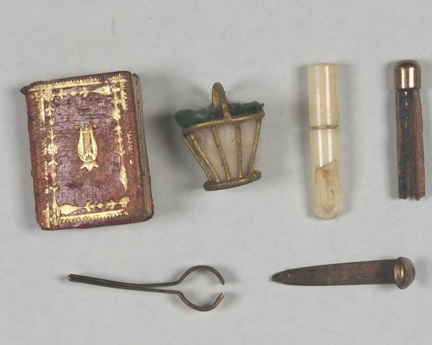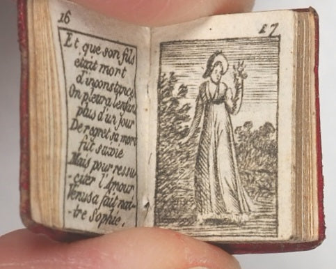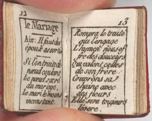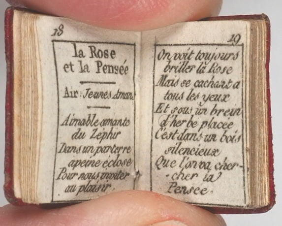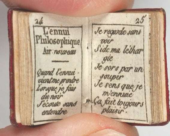 64 pages in French (last three blank apart from black borders). Eight engraved plates of women. Features lovers' songs, lovers' games, marriage, the resurrection of love, and the hymen and love. Together with a calendar.All edges gilt. No inscriptions. 16 x 20 mm. Original full red morocco, covers with gilt central lyre motif within elaborately tooled gilt borders. Spine and covers slightly rubbed. The original walnut shell etui is lined with peach silk and the original mirror in the lid. The hinges, and the fitted base are beautifully hand-crafted in original yellow metal mounts containing a miniature yellow metal basket pin cushion, tweezers, a miniarue bodkin, a damaged pencil, and stiletto. Possibly lacking two needles. Walnut shell casing in very good condition with wonderful patina. Not in Grand-Carteret. Spielmann, 399A. Welsh, 5546. in March 1952 a copy of this edition in a walnut shell etui sold for $50.00 (Schatzki). OCLC, 809035508. WorldCat records two copies worldwide (Koninklijke Bibiotheek, Pierpont Morgan Library). A charming miniature etui made out of a real walnut shell. Considered a marvel of craftsmanship, this etui would have been a conversation piece as well as being a luxurious, and sentimental object in the early 19th-century French Restoration period. It is a perfect example of a "book beautiful in all its forms," combining 1817 French publishing, specialised, tiny bookbinding, and the art of the keepsake etui.