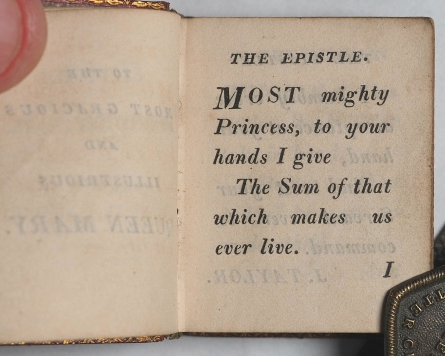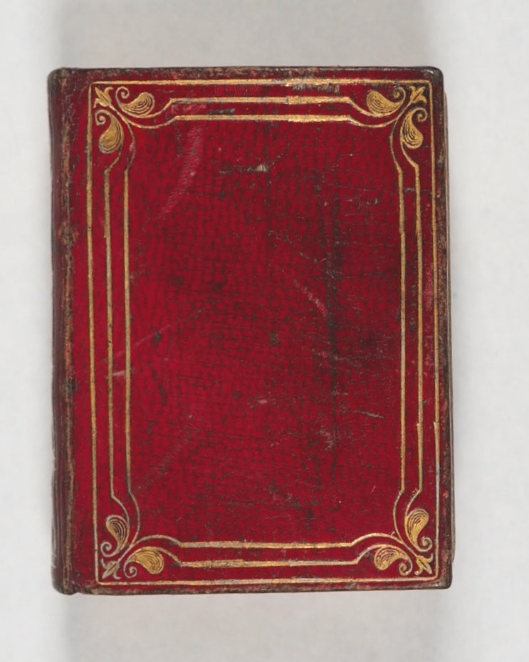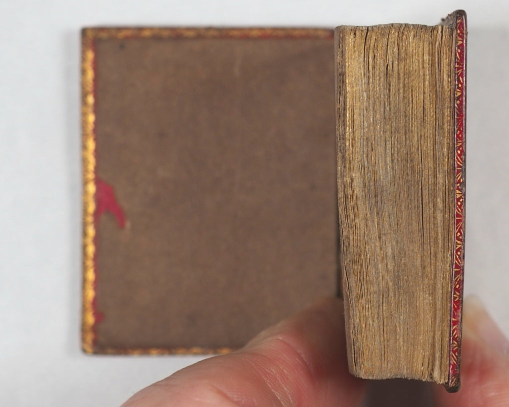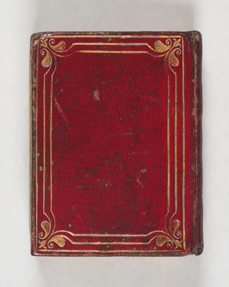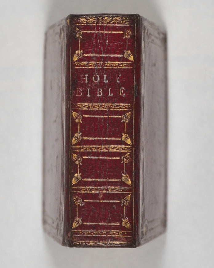 Unpaginated. [286] printed pages. Woodcut English title, "Holy Bible"; typographic English title; original and reprint imprimatur; typographic reproduction of original title, "Verbum Sempiternum. London : Printed by F. Collins for T. Ilive at the Nag's Head, in Jewen-street, 1693". New Testament has English section title, and typographic reproduction of the 1693 "Salvator Mundi" title. Signatures: A-I8; K8; (K8, blank); [a]8; b-g8; h8; (h7 & h8, blank). Lacks front free endpaper. Slight historic marginal staining C5-C8. 40 x 50 mm. Contemporary burgundy straight-grained morocco. Spine in gilt single fillet bordered compartments with acorn corner-pieces and horizontal foliate scrolling; boards with triple gilt fillet borders and stylised fleur-de-lis corner-pieces; inner gilt dentelles (slightly marked, wonderfully patinated, and a trifle rubbed, with a little wear to the hinges- but overall a beautiful character binding). An early reprint of the pre-eminent juvenile miniature bible in verse for easy memorising, by John Taylor, the 'Water-Poet'. The Taylor version is concise, impactful & expressive; this edition, apart from dedication to Queen Mary and King William, is the same as the original & has the charmingly unrevised spelling. This 1818 version, printed by W. Davy, is an exact reprint of the 1693 third edition originally printed by F. Collins for T. Ilive at the Nag’s Head. It preserves the rhyming couplets that summarize each book of the Bible.Adomeit's Three Centuries of Thumb Bibles said "unable to see a copy to verify details" but lists one copy in Julian Edison's collection in Missouri and the other in the British Museum. Adomeit, B53. Johnston, ix. Spielmann, 495. Welsh, 1217. Not in Houghton. Of this edition, WorldCat locates just the British Library copy, but another copy also held at Indiana University. While originally meant for adults, these tiny books became popular as educational "toy books" for children to teach basic biblical literacy and moral virtues in a compact, portable form.