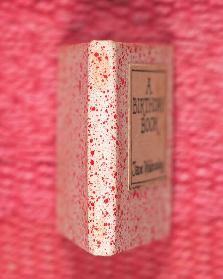 15 pages, 13 of them hand coloured full-page illustrated letters. Original yellow speckled endpapers. Dated in ink by hand on blank preliminary 13th October 1986. In the same hand on the following page, inscribed from Sue to Gill. The book's pages spell out `Happy Birthday’. Each letter is beautifully illuminated in colour by hand by Jane Walmsley. 26 x 31 mm. Staple bound. Original cream and crimson speckled boards with ivory paper label on upper cover with block printed title and author in black.