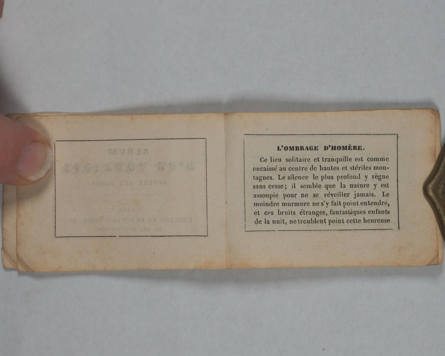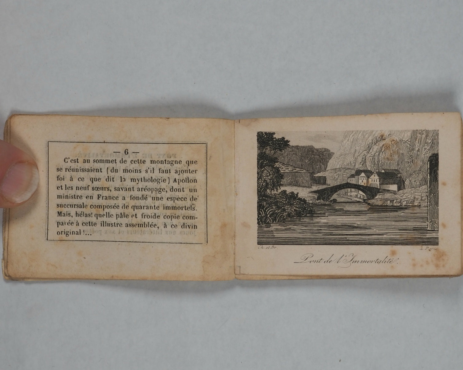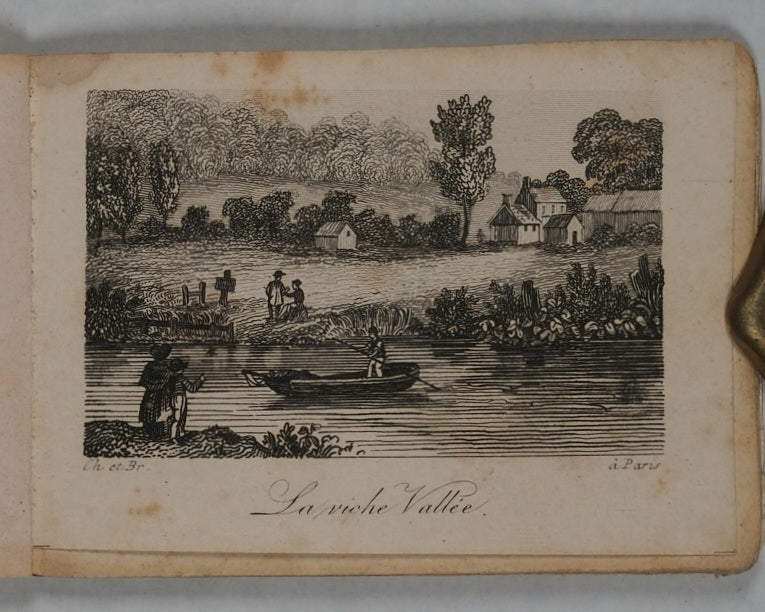 20 pages in French. 5 engravings, signed in the plate, Chezaud et Braulart, Paris. Printed by Dondey-Dupré, Rue St-Louis, 46, au Marais. No inscriptions. 66 x 46 mm. Original yellow glossy paper wrappers. Foot of spine slightly worn, covers slightly creased, edges with a few minuscule closed tears, and corners folded. Not in Bondy, nor Spielmann, nor Welsh. OCLC, 958830926. WorldCat records one sole copy worldwide at the Pierpont Morgan Library. The locations described and illustrated are romantic and imaginary idylls, such as the Immortal Bridge and the Lush Valley. The final page mentions seventeenth century painters Teniers and Paul Potter and their love of pastoral nature. This is a rare and beautifully illustrated miniature book in its original publisher's wrappers.