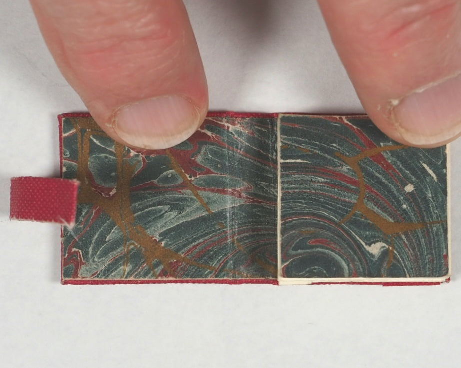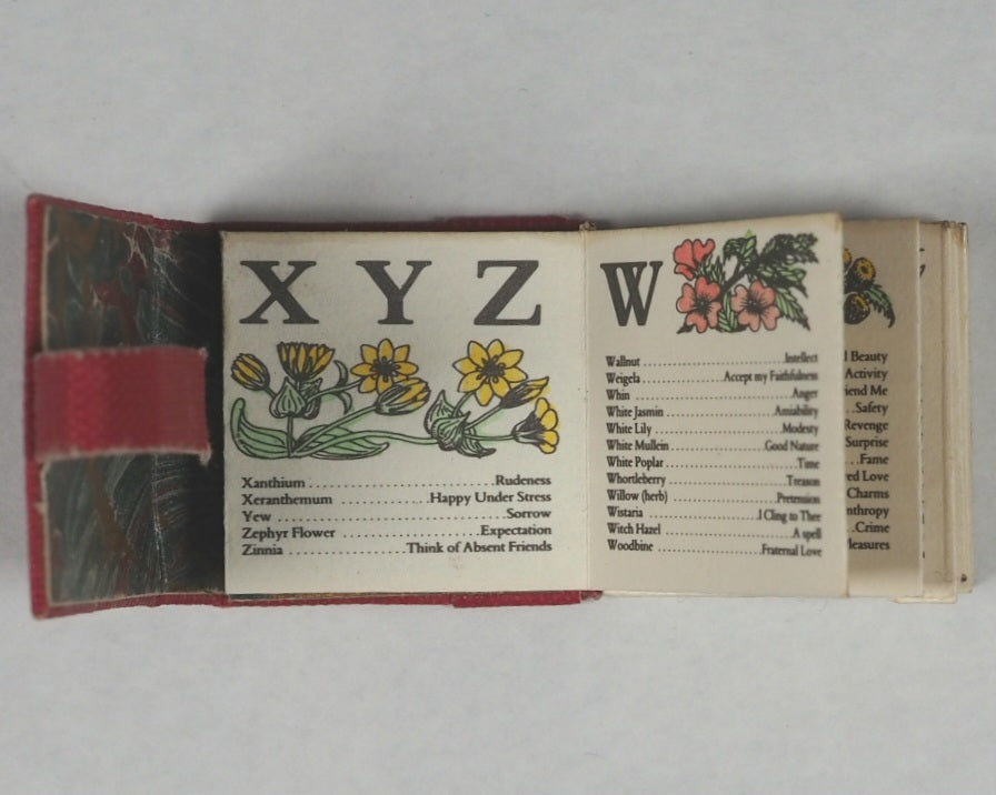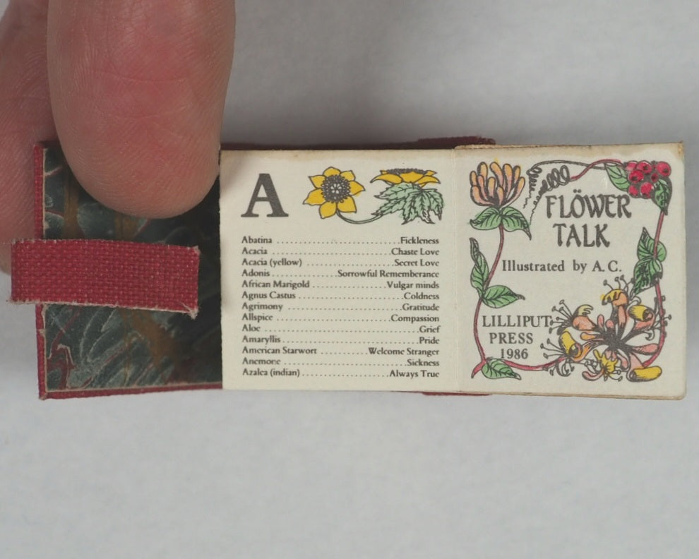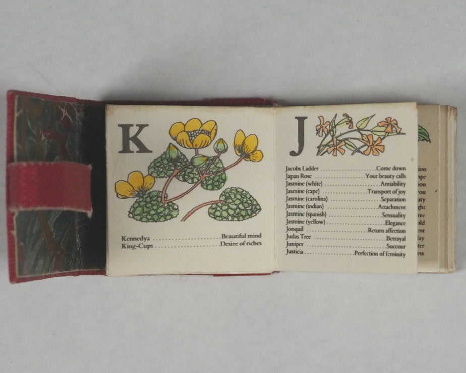 [25] pages). 24 delicate, hand-coloured illustrations by A. Clements, covering an A to Z of the Victorian language of flowers. Accordion folded. Housed in the original publisher's pink cloth wallet-style binding with a tuck-in flap, featuring gilt titles, and hand-marbled endpapers. 20 x 20 mm. OCLC,  45662042 . WorldCat locates eight copies worldwide (Pierpont Morgan, Lafayette, Delaware, Virginia, Indiana, Iowa, Coffey County, and San Diego Libraries). This is an exceptionally rare, first edition, limited to only 55 copies. Being copy number 6 makes it a very early, low-number, and signed copy. This item represents a fine example of modern private press micro-miniature book production from the 1980s.