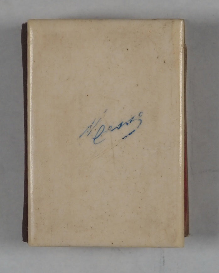 96 pages in French. Three engraved plates. Printed by Firmin Didot Frères, rue Jacob, 58 [Paris].  Title page printed in blue. All pages with printed decorative borders. All edges gilt over red. Original rose pink silk endpapers. No inscriptions. 40 x 56 mm. Original red silk spine; bone covers with Messe in blue on the upper cover. Irregular black or brown dots and short non-parallel slashes - the Haversian system that distinguishes it as bone. Slightly rubbed from being held so many times in someone's hand over the last 186 years. OCLC,1302332629. WorldCat records one copy worldwide (Library of Congress).