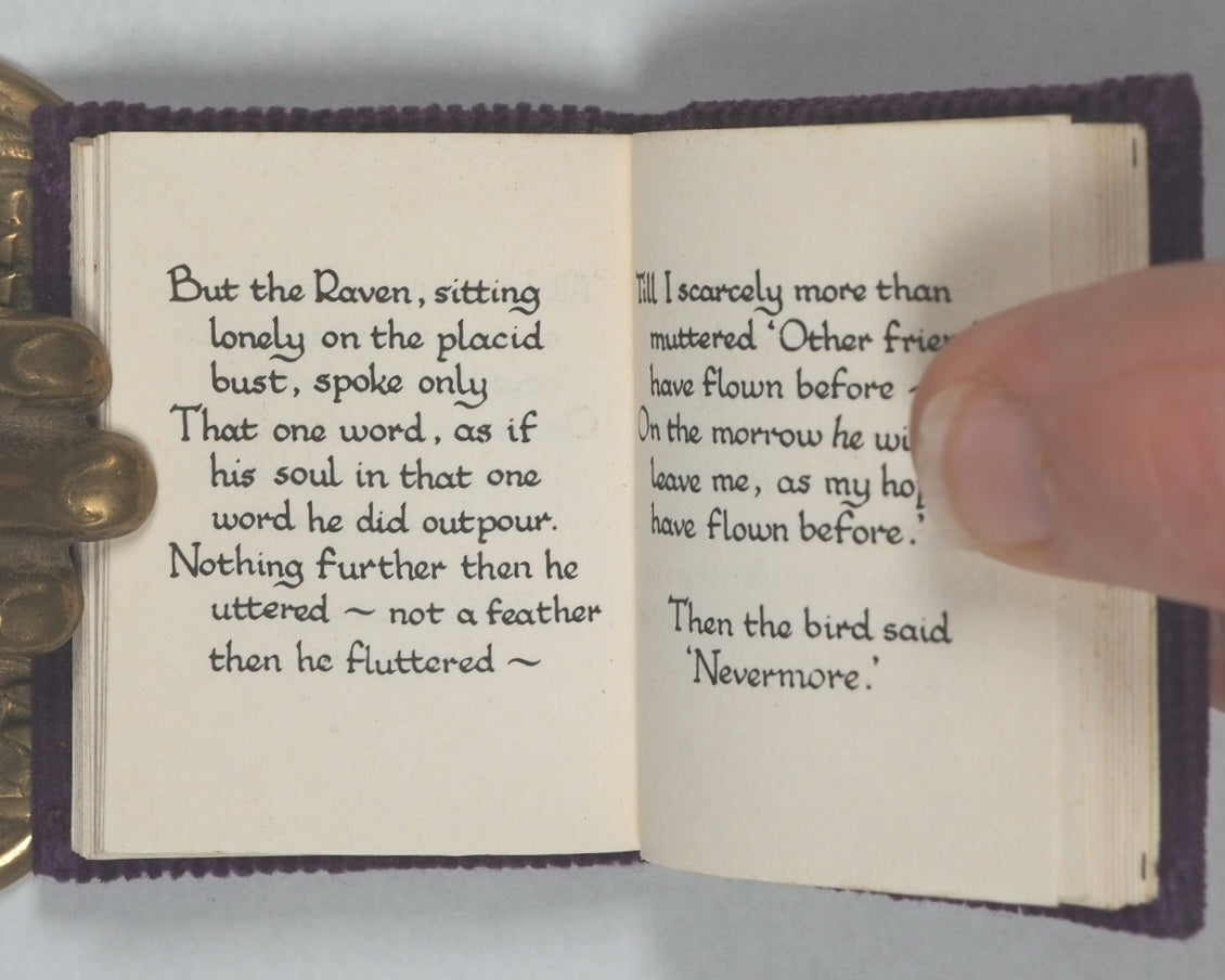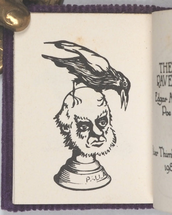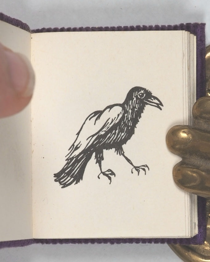 41 unnumbered pages including 2 full-page woodcuts at beginning and end, frontispiece and colophon. It features a caricature frontispiece of Poe and the bird, and is a printed calligraphic interpretation of the famous 1845 poem. 45 x 54 mm. Original hand-bound in vertically striped full purple velour. Printed white label on upper cover with block titling and circular purple paper border. This edition was privately printed by Gordon Murray, publisher of Silver Thimble miniature books.