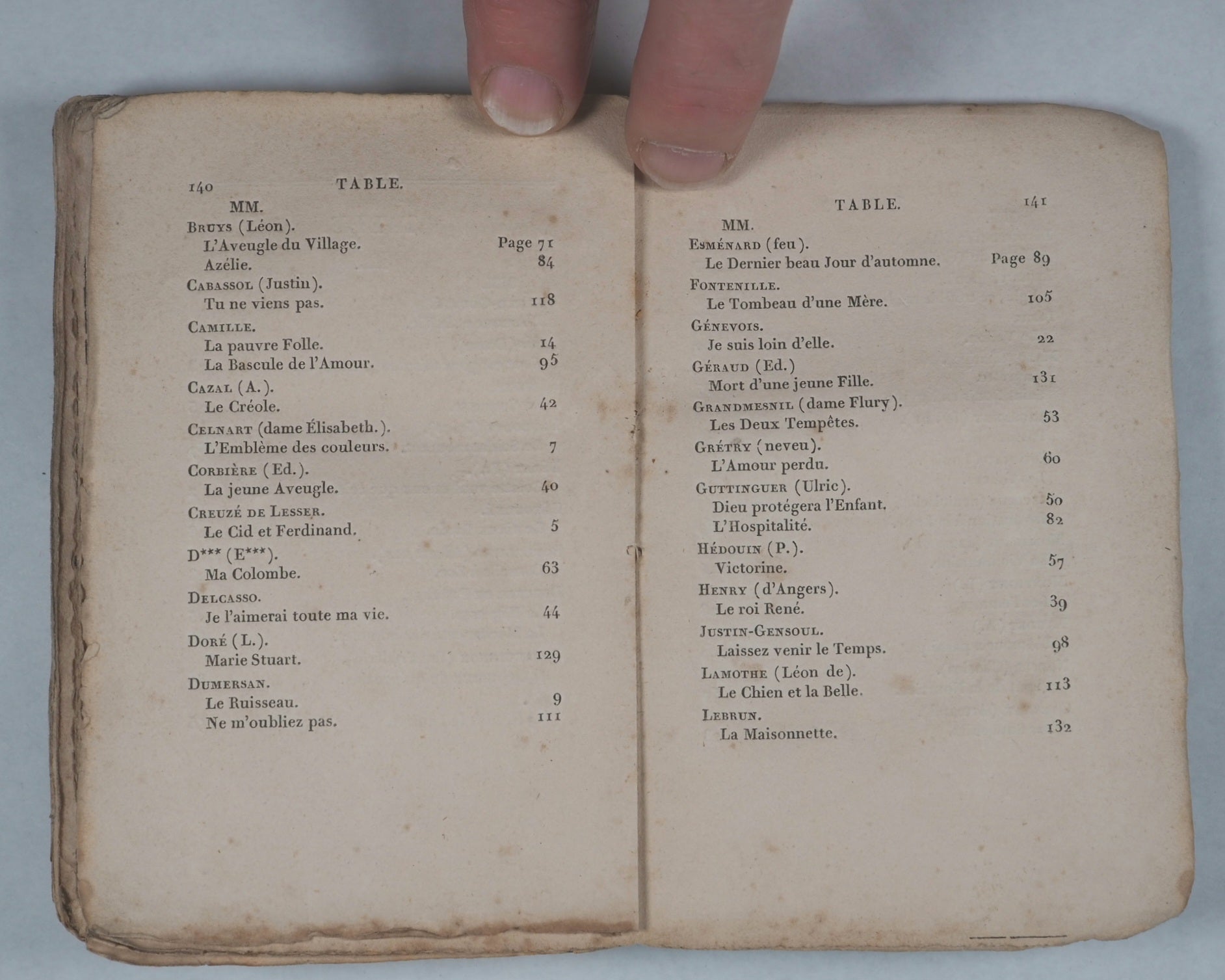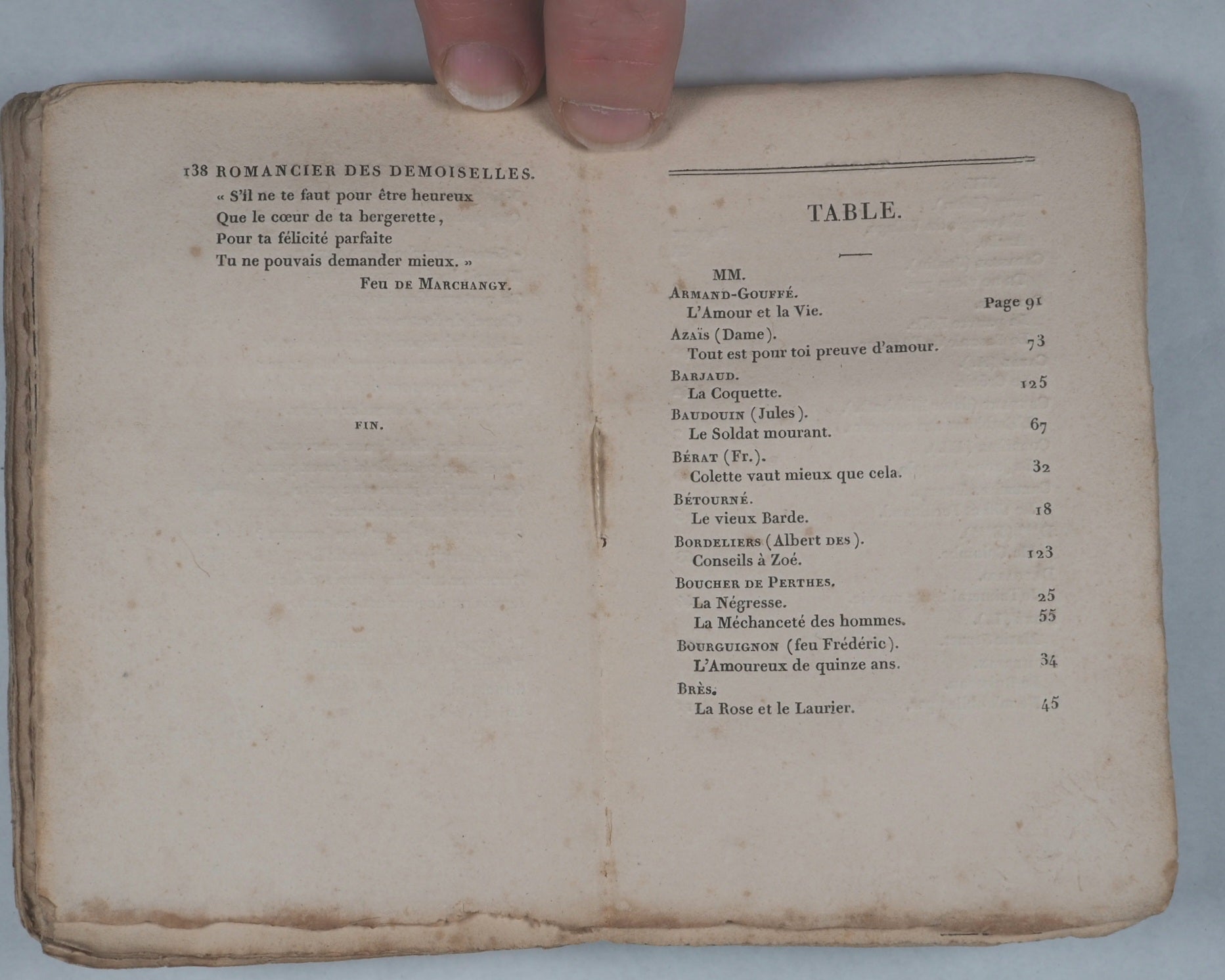 144 pages in French. Engraved title page. Frontispiece and one engraved plate. Printed by Imprimerie de Rignoux, Rue des Francs- Bourgeois-Saint-Michel, no. 8. Paris. Pages untrimmed. No inscriptions. 87 x 130 mm. Original green paper wrappers. OCLC, 461035439. WorldCat records just one sole copy (Bibliothèque Nationale de France). Charming collection of songs and poetry from 59 mainly French authors and eight anonymous writings, reflecting the cultural focus on cultivating "young ladies" (demoiselles) through education and refinement through reading.