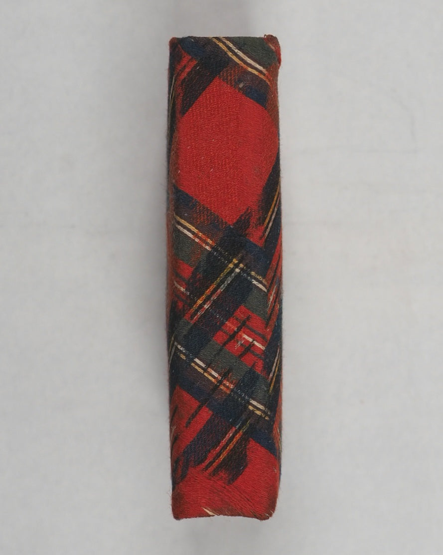 240 printed pages. Portrait frontispiece.11 black & white plates. Thistle Library. Rounded corners. All edges red. Original marbled endpapers. No inscriptions. Complete with index and glossary. 60 x 86 mm. Original tartan silk from the Royal Stewart clan with label on rear paste-down endpaper indicating it; tartan slightly worn in parts. Not in Bondy, nor Spielmann, nor Welsh. WorldCat locates no copies worldwide. Similar to Bryce edition from 1890s (Golden Thoughts & Tartan series, 23. Welsh, 1530). Originally sold as a tourist memento, it is now mostly wanted by those who remember the annual Burns night celebrations.