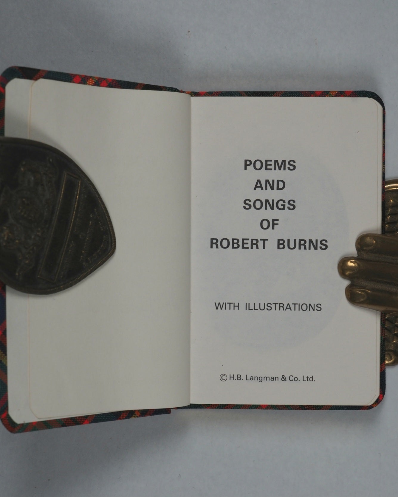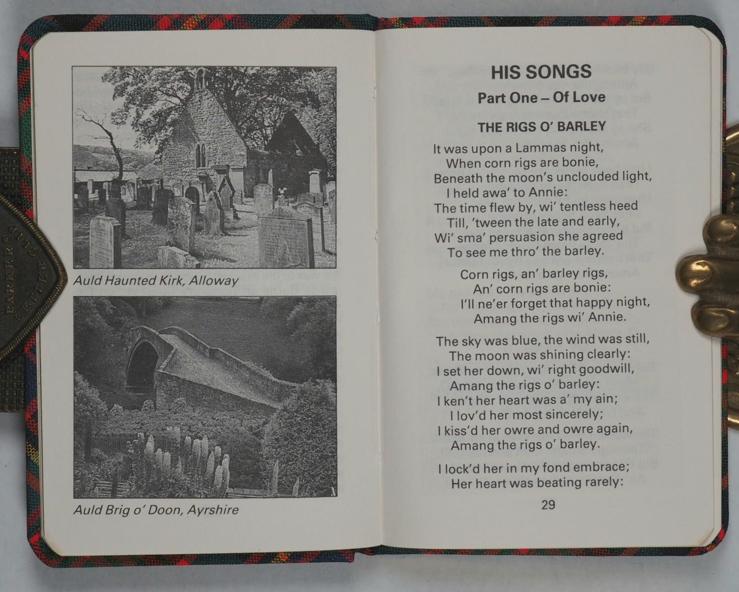 192 pages. Numerous black and white full-page photographic illustrations. Very clear type in English. Rounded corners. All edges gilt. It is four and a quarter inches tall by two and three-quarter inches wide. It is bound in a MacPherson Clan tartan cloth.