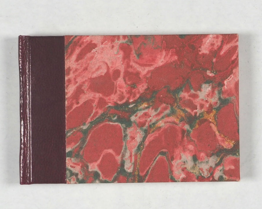 43 pages. 7 full-page illustrations in green by Pall W. Bohne. Letterpress on Warren's Eggshell antique white paper. Printing was done on an Old Series 10 x 15 Chandler & Price platen press. Number 68 of 300 hand-numbered copies. 65 x 45 mm. Original burgundy leather spine with gilt blocked lettering. French marbled paper-covered boards. Bradbury, 29. OCLC, 12590985. WorldCat records eleven copies worldwide. This is the third of four titles that Bohne published , all miniature books under the Bookhaven Press imprint, previous to which he had been a bookbinder. 60 125 #