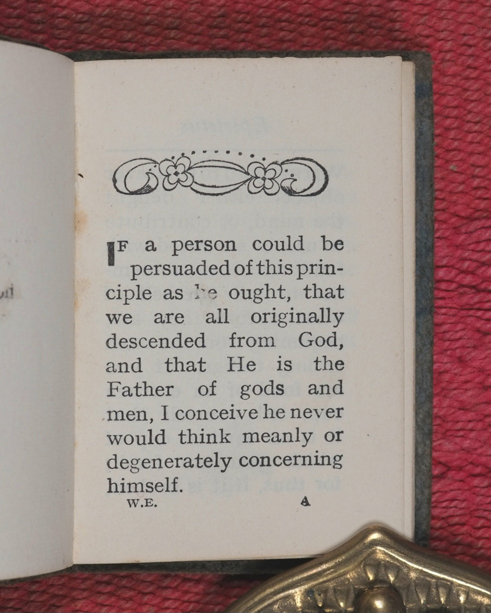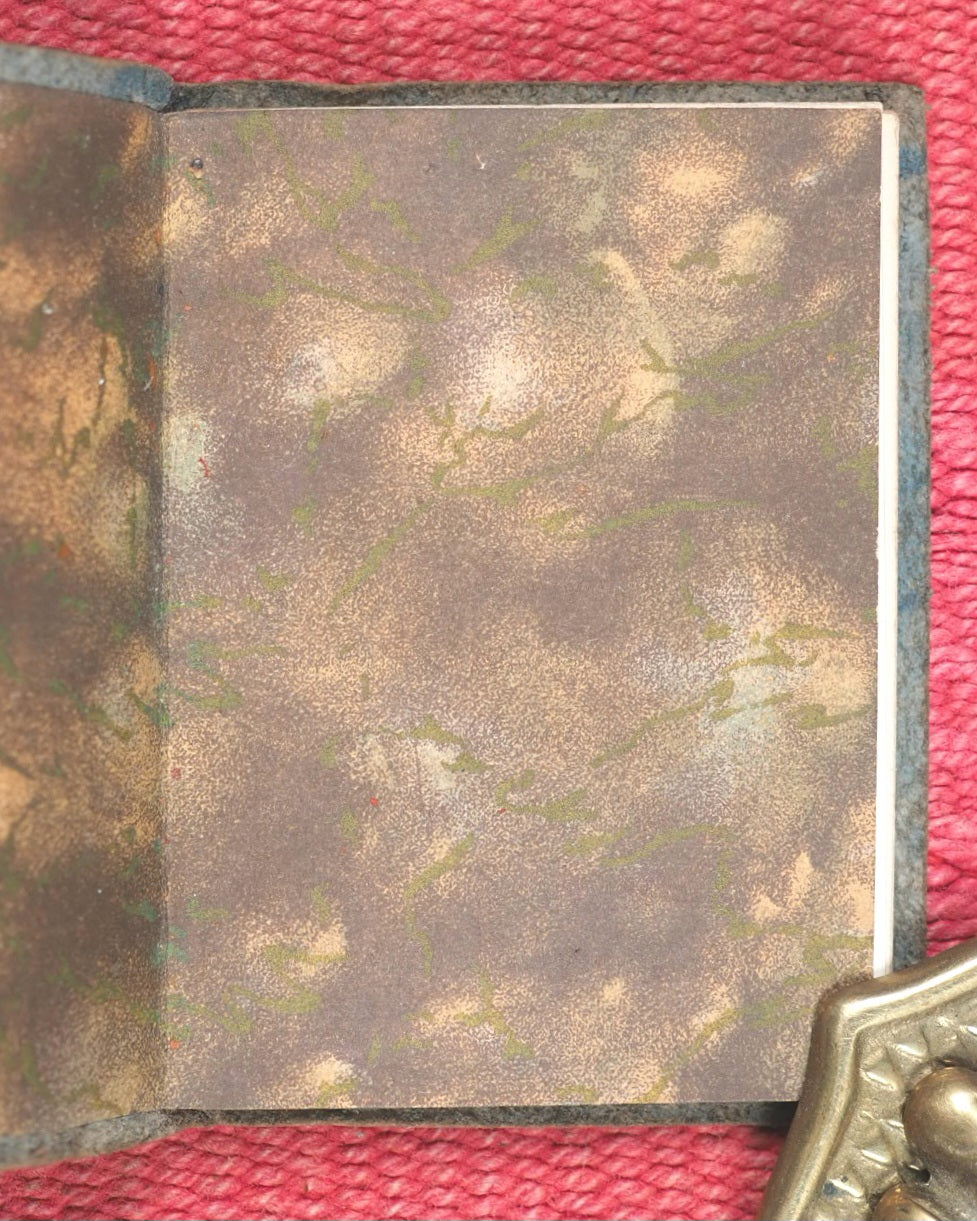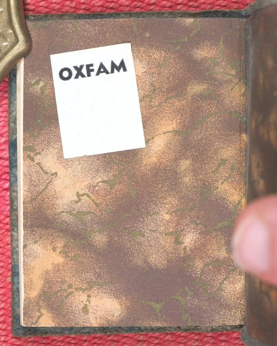 [64] pages. Illustrated title-page and frontispiece on glossy coated paper. Attractive woodcut head and tail-pieces. Top edge gilt. Original decorated endpapers. Vintage minuscule printed Oxfam label on rear free endpaper. Oxfam's retail history spans nearly 80 years, from the first temporary Oxfam shop which was set up to raise funds for the Greek famine emergency in 1943, to the present day. 56 x 74 mm. Publishers blue marbled yapp-style calf. Title in gilt on upper cover. Welsh, 2684. OCLC, 47707895. WorldCat locates two copies worldwide (Indiana, and San Diego University Libraries).