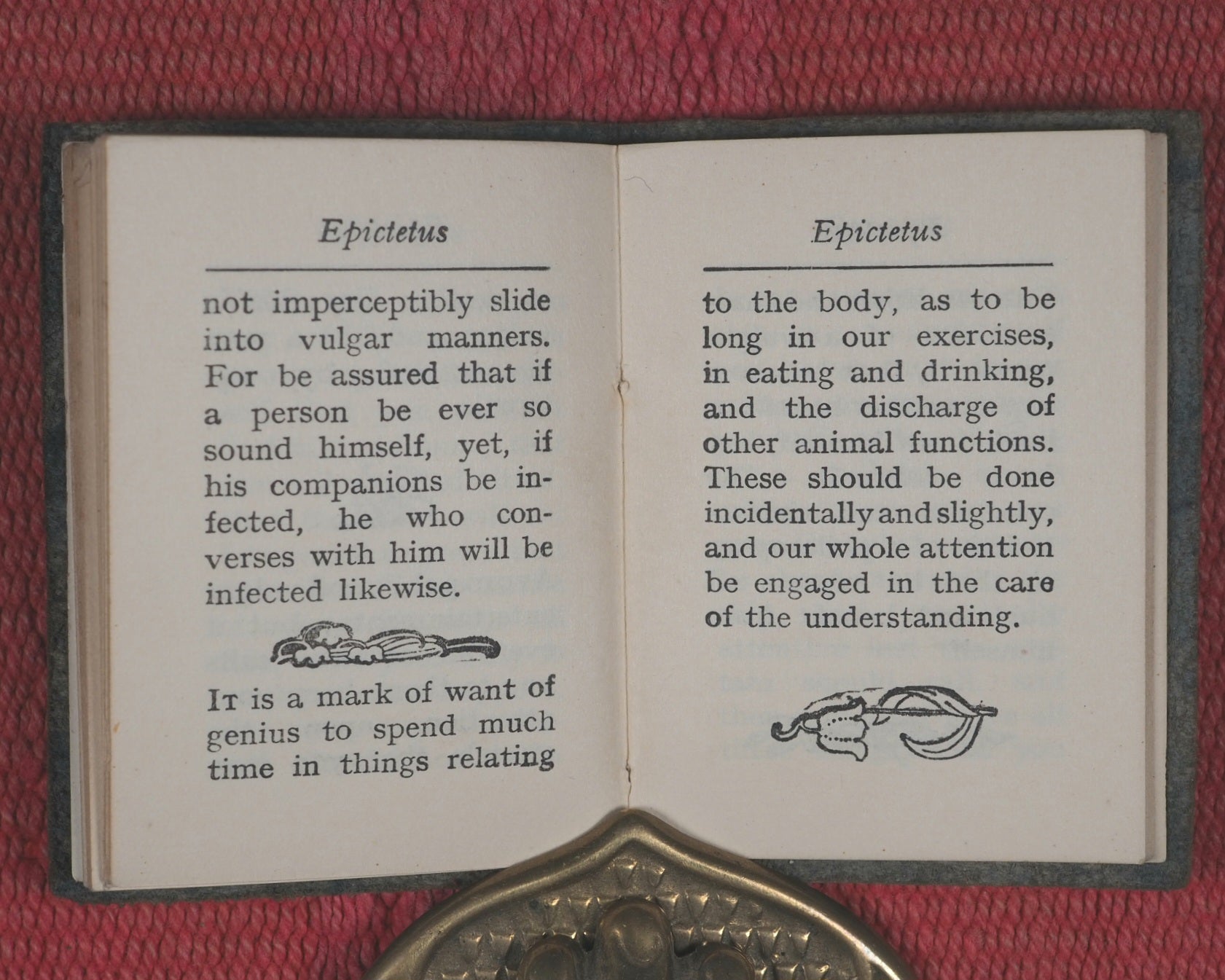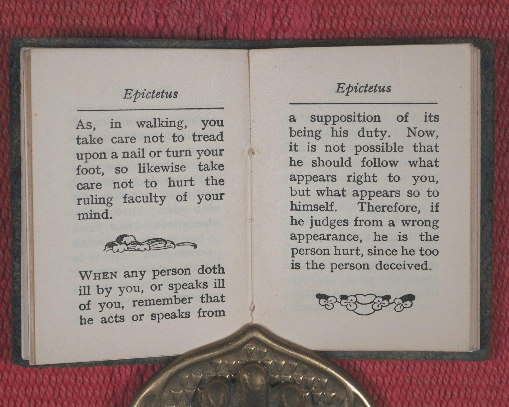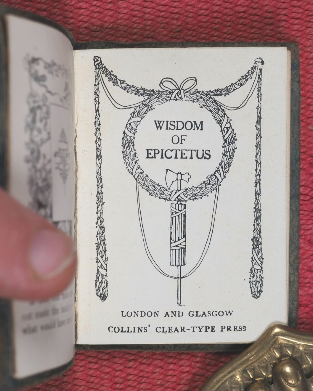 [64] pages. Illustrated title-page and frontispiece on glossy coated paper. Attractive woodcut head and tail-pieces. Top edge gilt. Original decorated endpapers. Vintage minuscule printed Oxfam label on rear free endpaper. Oxfam's retail history spans nearly 80 years, from the first temporary Oxfam shop which was set up to raise funds for the Greek famine emergency in 1943, to the present day. 56 x 74 mm. Publishers blue marbled yapp-style calf. Title in gilt on upper cover. Welsh, 2684. OCLC, 47707895. WorldCat locates two copies worldwide (Indiana, and San Diego University Libraries).