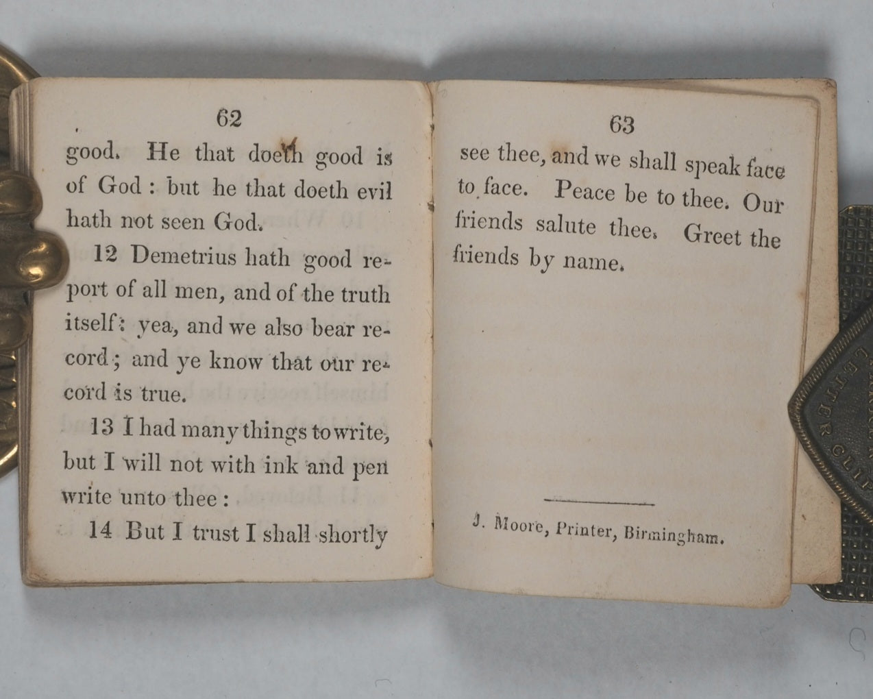 63 printed pages. Printed by J. Moore, Birmingham. All edges gilt. Contemporary pencil ownership signature on front paste-down endpaper. Provenance: D. Brown. 53 x 65 mm. Original publisher's full black calf. Spine in three compartments with gilt anthemion devices and double gilt horizontal rules; covers gilt blocked titling and with single filet gilt borders and front cover with gilt titling. Bondy, 130 (for similar titles/same publisher). Not in Spielmann. Welsh, 829 (mentions three copies). OCLC, 39208988. WorldCat locates 4 copies worldwide (Virginia, Indiana, Washington/St.Louis, and Harry Ransom University Libraries). Extremely uncommon provincially printed miniature book in near original condition, virtually 200 years old. These were designed to fit easily into a pocket or the palm of a hand, reflecting the 19th-century demand for portable, personal devotional texts - for intimate, personal meditation, or as a thoughtful, pocket-sized gift, often used by laypeople in their daily life. Rather than being produced by a large, well-known London religious society, this edition was published by T. Groom, a small printer located at Islington-Row in Birmingham. This reflects the active, local production of religious literature in provincial industrial cities during the period, and is now a specialized, niche collector's item.