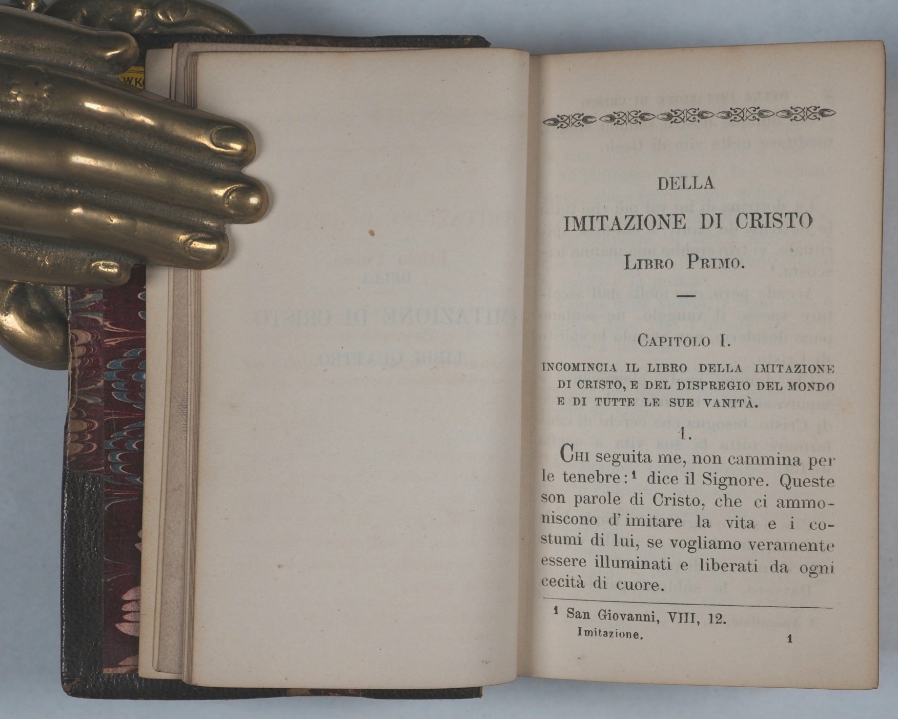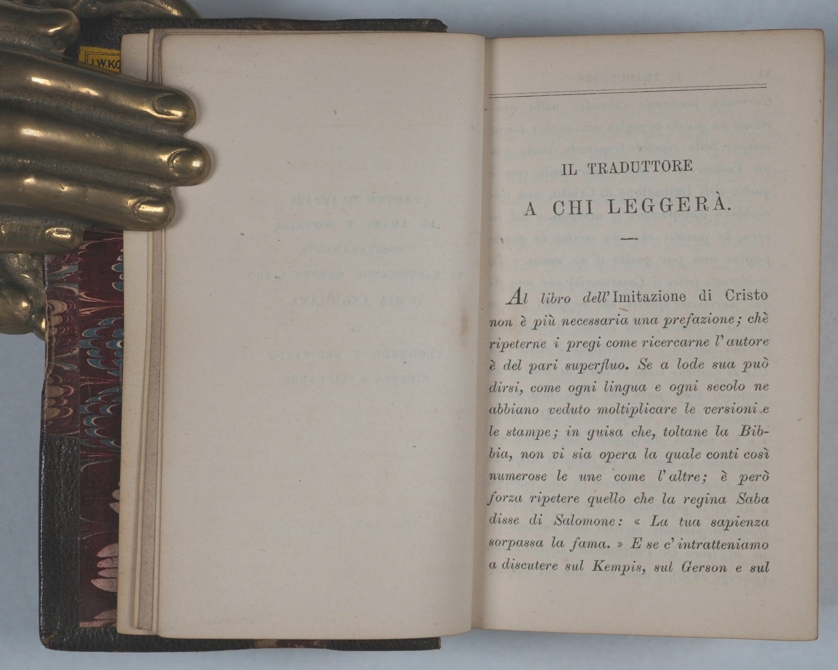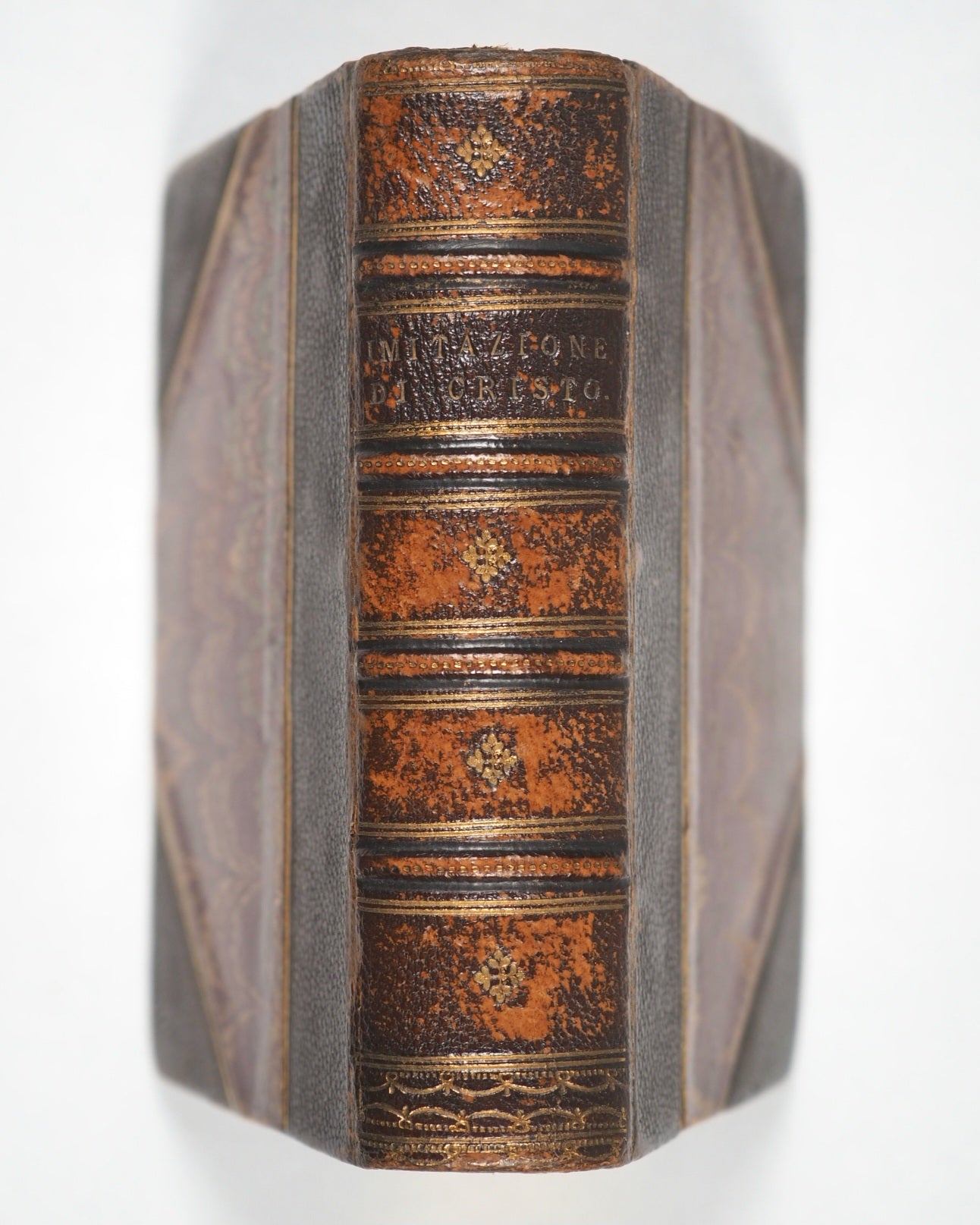 First edition thus. xi, 506 printed pages. Frontispiece. Mild age-toning. All edges gilt. Original marbled emdpapers. Bookseller's label on front free endpaper for J.W.Kolckmann, 'Foreign Library', 2 Langham Place. W. London. 58 x 96 mm. (page size). Contemporary half brown morocco; spine with raised bands, burgundy label with gilt block titling. A little rubbed. Not in Bondy, nor Spielmann, nor Welsh. For second edition see OCLC,  820737762 (one copy located - British Library). WorldCat locates no copies of 1st edition worldwide. Barbèra was a prestigious publisher known for high-quality editions of both classical and contemporary works. Published in 1866, this edition reflects the cultural and religious landscape of post-unification Italy, where classic spiritual texts were being brought into modern, refined language. The Imitation of Christ has continued to influence Christian spirituality for centuries.