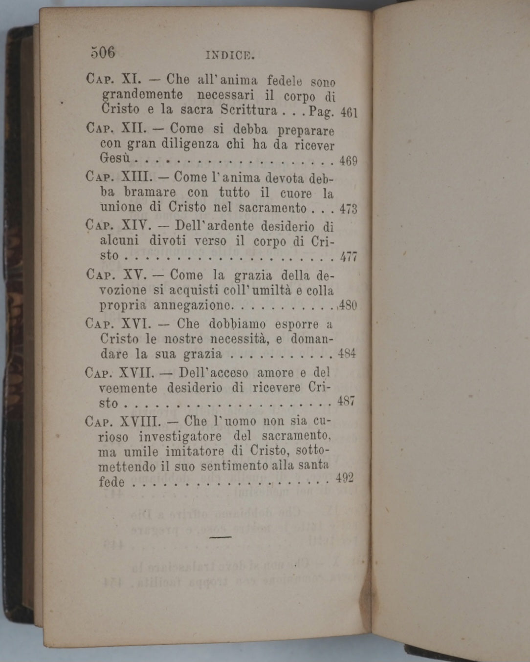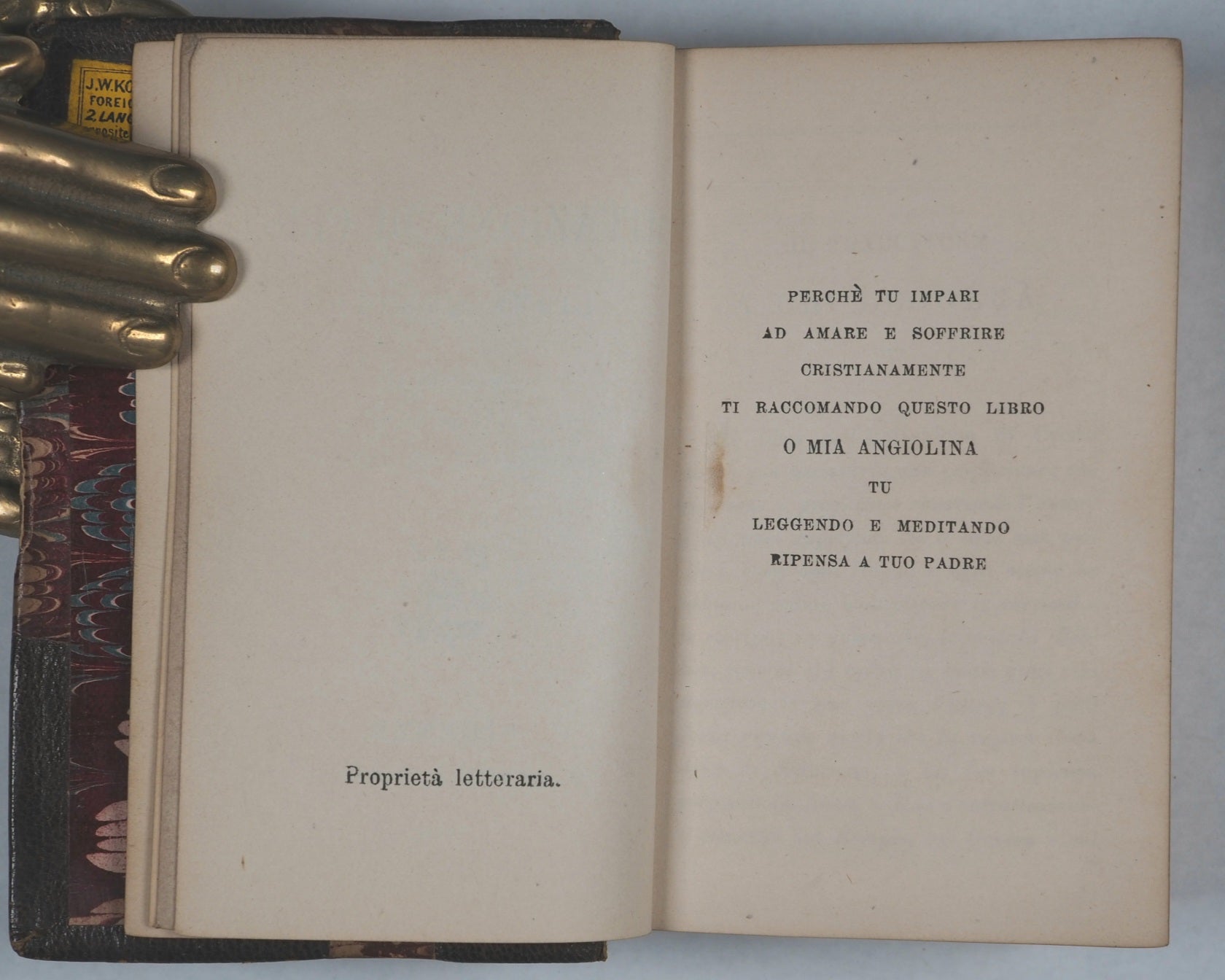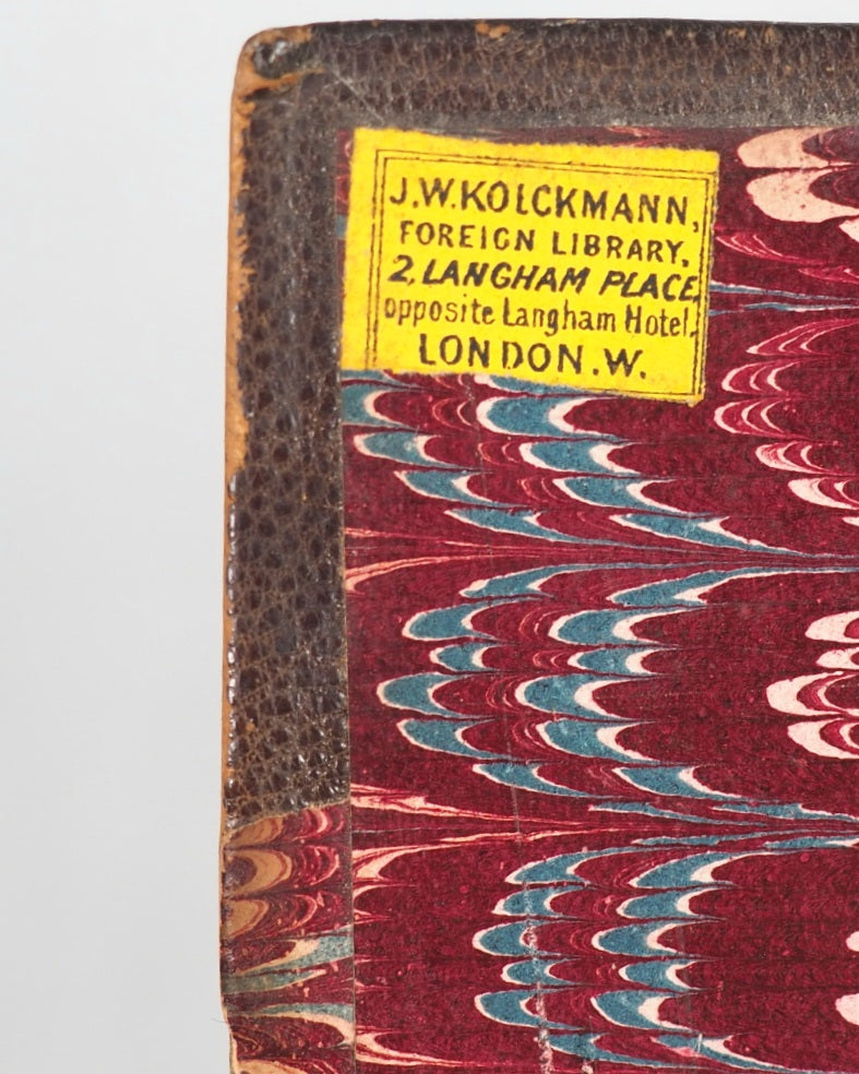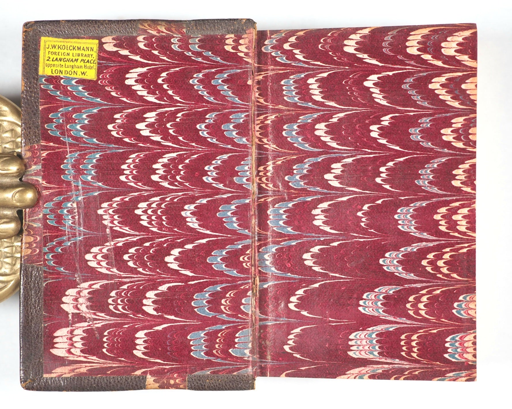 First edition thus. xi, 506 printed pages. Frontispiece. Mild age-toning. All edges gilt. Original marbled emdpapers. Bookseller's label on front free endpaper for J.W.Kolckmann, 'Foreign Library', 2 Langham Place. W. London. 58 x 96 mm. (page size). Contemporary half brown morocco; spine with raised bands, burgundy label with gilt block titling. A little rubbed. Not in Bondy, nor Spielmann, nor Welsh. For second edition see OCLC,  820737762 (one copy located - British Library). WorldCat locates no copies of 1st edition worldwide. Barbèra was a prestigious publisher known for high-quality editions of both classical and contemporary works. Published in 1866, this edition reflects the cultural and religious landscape of post-unification Italy, where classic spiritual texts were being brought into modern, refined language. The Imitation of Christ has continued to influence Christian spirituality for centuries.