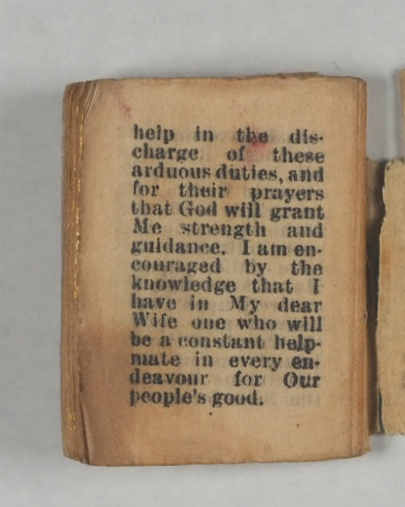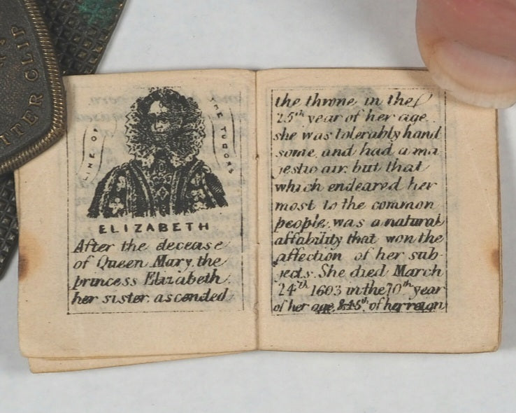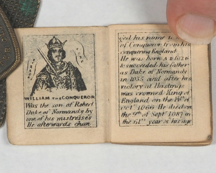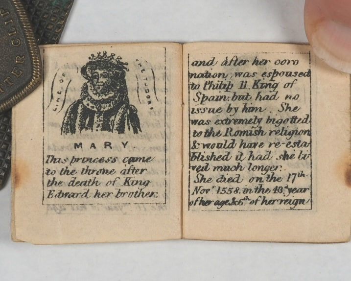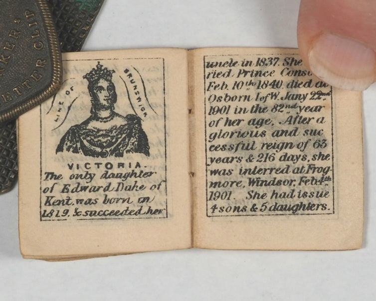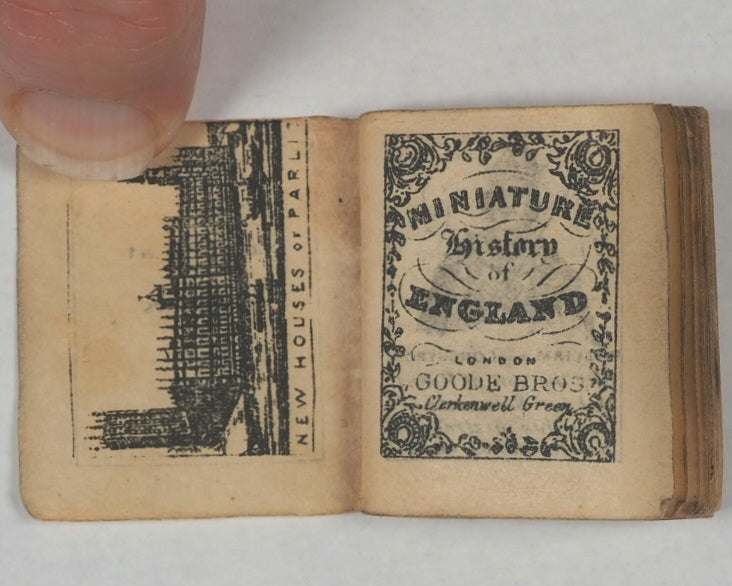 50 unnumbered pages. Frontispiece and four central full-page illustrations of London landmarks. 36 vignette portraits of English monarchs from William the Conqueror to George V. 5 pages of George V's maiden speech at end. All edges gilt. Some mild occasional spotting and some page corners folded. 30 x 35 mm. Original black paper wrappers. Gilt lettering completely faded and wrappers slightly torn and damaged - also loose. Bondy, 143 .Welsh, 5046. A similar edition is in the Queen Mary's Dolls' House in Windsor Castle. Goode's penny publications, such as this, made reading accessible to the growing working-class readership, encouraging literacy. This publication was one of the stock penny lines of the London street vendors and is interesting for its illustrations and specific literary form combining prose and poetry; the dual approach aimed to engage readers through different literary styles: descriptive prose for factual accounts and poetic verse for devotional or reflective passages. Dramatic illustrations made them the precursors to penny dreadfuls and modern comics.