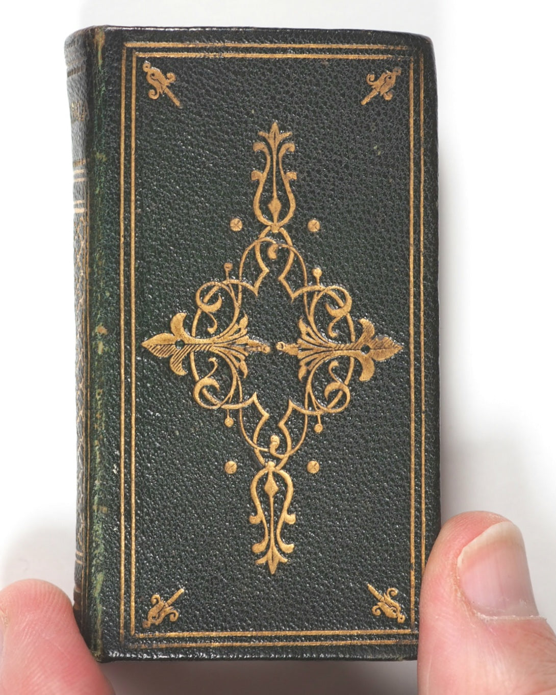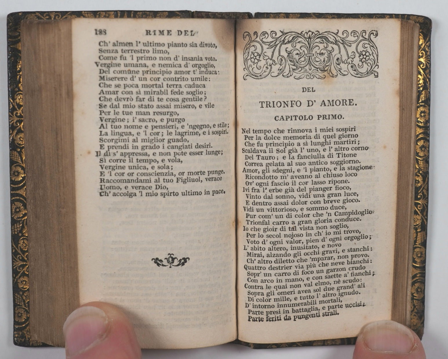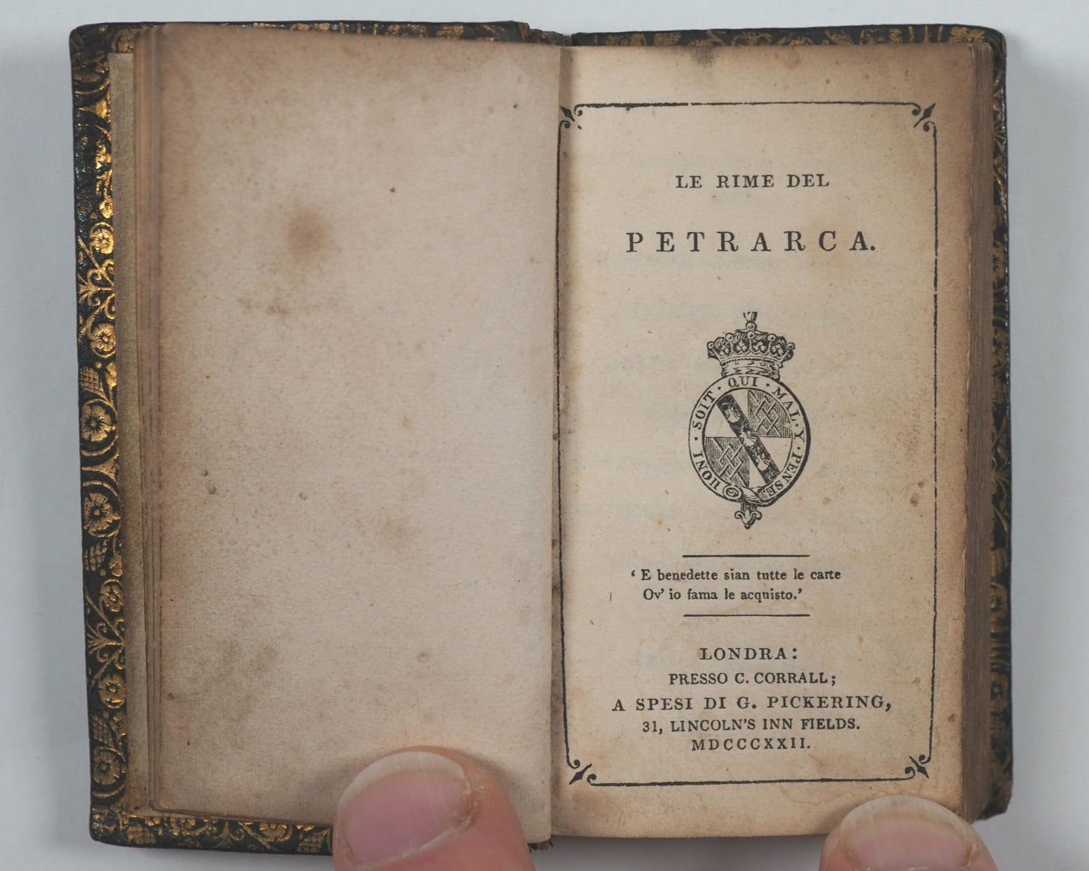 [4ff], 237, [10] printed pages in Italian. Engraved frontispiece and additional title-page. Includes index. Printed by Charles Corrall. First edition. All edges gilt. Inner gilt dentelles. Original primrose endpapers. Some leaves blackened in top inner margin. 46 x 82 mm. Contemporary full green morocco; spine richly decorated in gilt trellis motif with horizontal rules and gilt blocked titling; covers hand-tooled with symmetrical, arabesque central motif and complementary corner pieces. Slightly rubbed at corners and some edges. Spielmann, 407. Houghton, 194. Welsh, 5660. OCLC, 1450022024. An early example of a Pickering title because in 1826 he moved to Chancery lane. From Pickering's "Diamond Classics" series, a popular collection of miniature books designed to be affordable and portable. The small size (typically around 88 x 44 mm) was a significant achievement in printing technology at the time, utilizing a tiny 4.5-point type. Petrarch is widely known as the "father of Renaissance humanism", perfecting the 14-line sonnet form and having a major influence on subsequent lyric poetry across Europe.