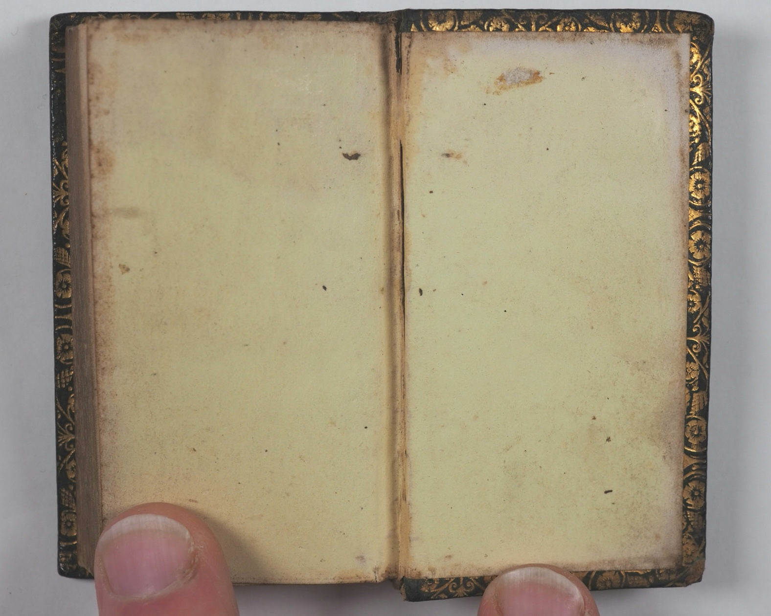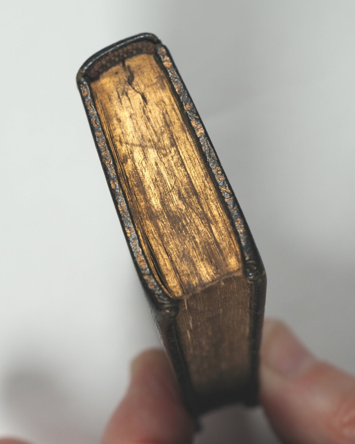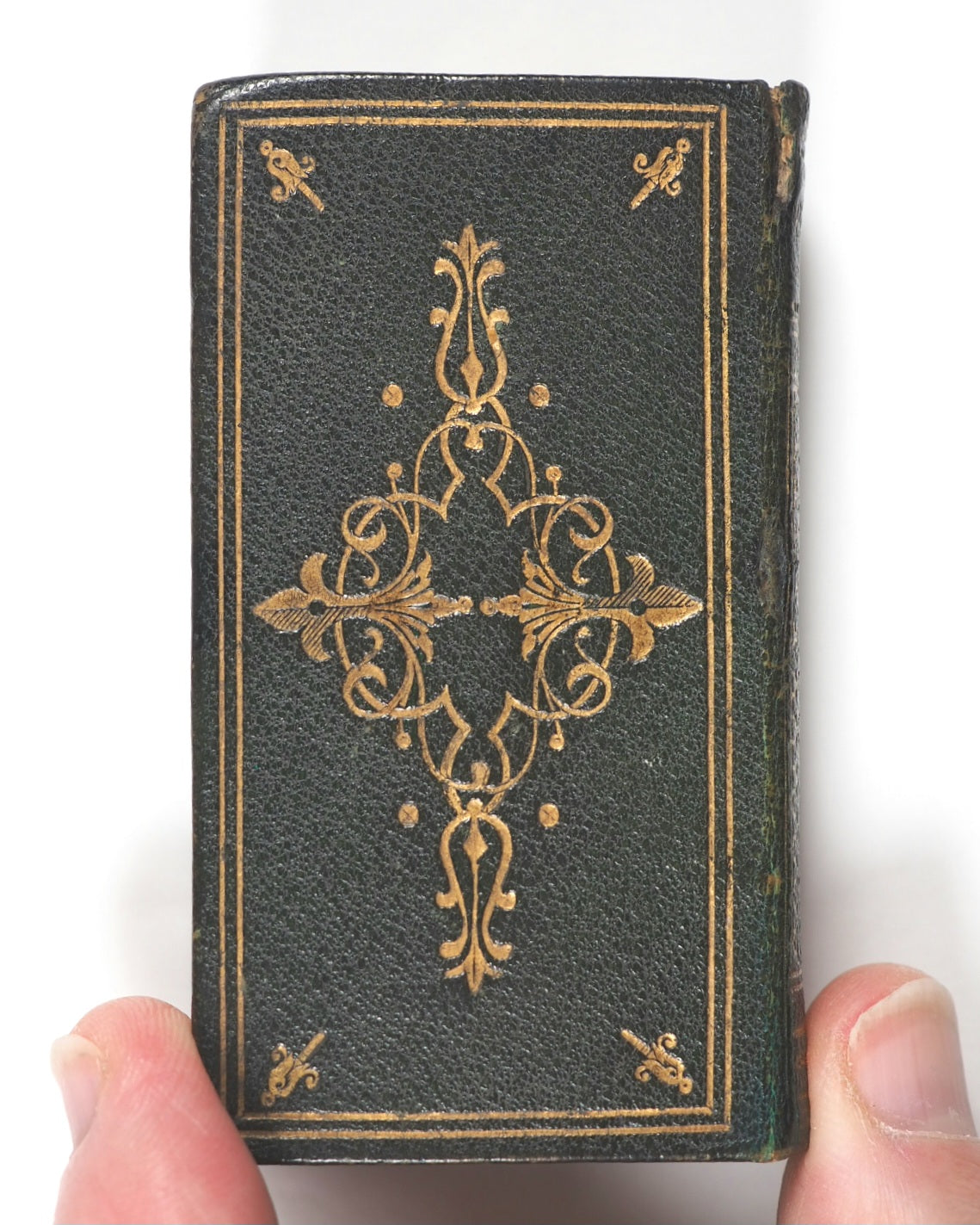 [4ff], 237, [10] printed pages in Italian. Engraved frontispiece and additional title-page. Includes index. Printed by Charles Corrall. First edition. All edges gilt. Inner gilt dentelles. Original primrose endpapers. Some leaves blackened in top inner margin. 46 x 82 mm. Contemporary full green morocco; spine richly decorated in gilt trellis motif with horizontal rules and gilt blocked titling; covers hand-tooled with symmetrical, arabesque central motif and complementary corner pieces. Slightly rubbed at corners and some edges. Spielmann, 407. Houghton, 194. Welsh, 5660. OCLC, 1450022024. An early example of a Pickering title because in 1826 he moved to Chancery lane. From Pickering's "Diamond Classics" series, a popular collection of miniature books designed to be affordable and portable. The small size (typically around 88 x 44 mm) was a significant achievement in printing technology at the time, utilizing a tiny 4.5-point type. Petrarch is widely known as the "father of Renaissance humanism", perfecting the 14-line sonnet form and having a major influence on subsequent lyric poetry across Europe.