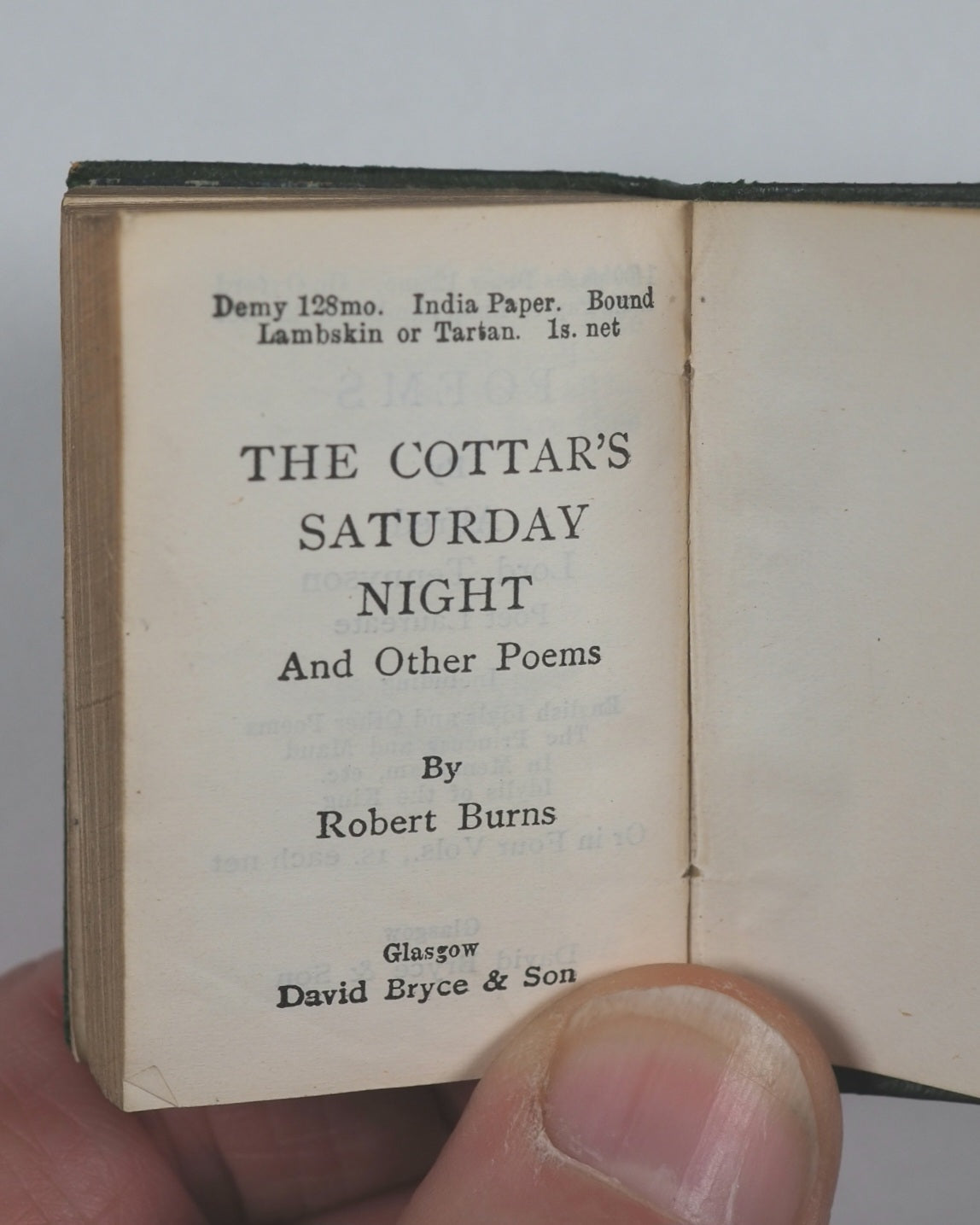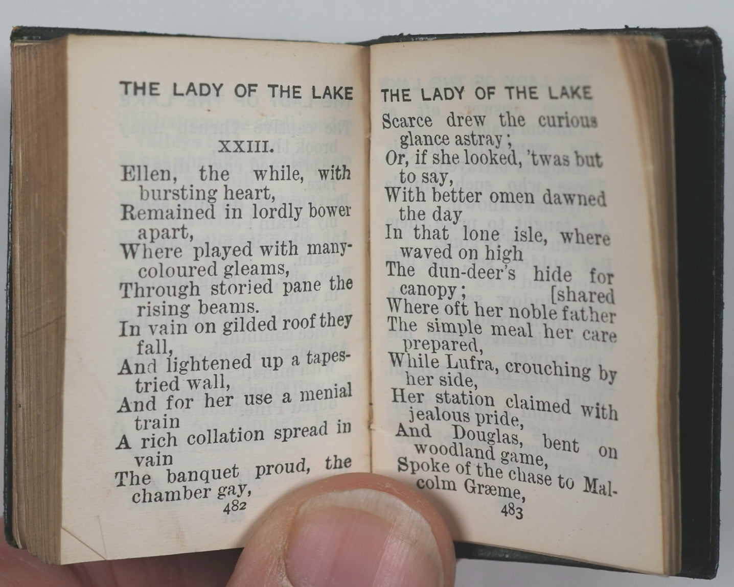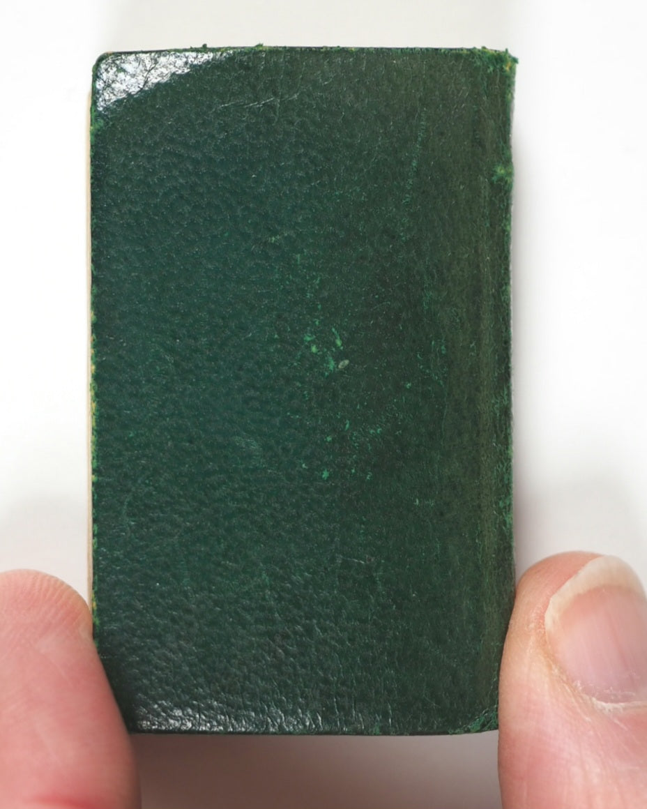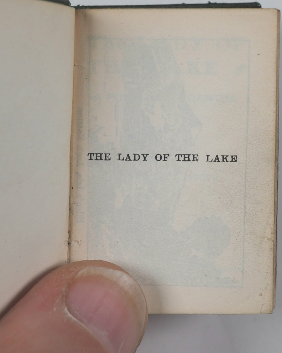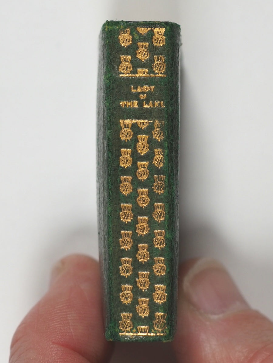 [2, blank], half-title, frontispiece, title-page, colophon ('Printed at University press, Glasgow. MCMV. '), 7-507 numbered pages, [1], + 2 pages publisher's adverts at end (for Tennyson's 'Poems' and Burns' 'Cottars Saturday night' in similar Demi 128mo formats). Fine India paper. Ellen Terry Miniature Library. Top edges gilt. Original blue endpapers. No inscriptions. 35 x 50 mm. Original green lambskin; gilt thistle decoration and titling on spine; gilt titling and image of female on a small boat on front cover. Bondy,116. See Welsh, 6196 for Bryce and New York Frederick Stokes Co. edition. See OCLC, 291099305 for Bryce/Stokes edition. WorldCat locates 10 copies worldwide of the Bryce/Stokes edition but no copies of this Bryce/Frowde imprint. Sir Walter Scott's The Lady of the Lake (1810) was a massive cultural phenomenon, popularizing the Scottish Highlands, especially Loch Katrine and the Trossachs, creating a tourism boom, blending historical figures such as King James V with romance, and establishing Scott as a literary giant.
