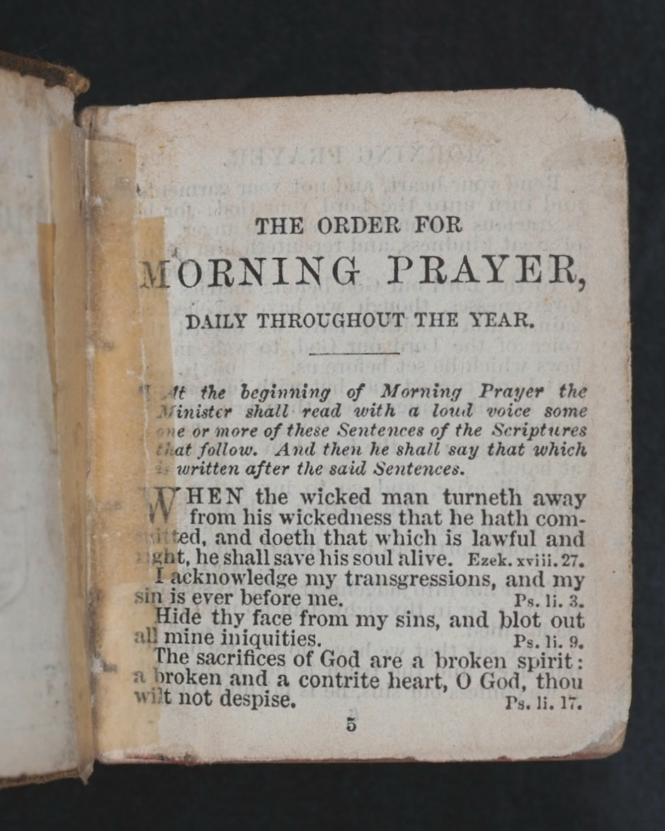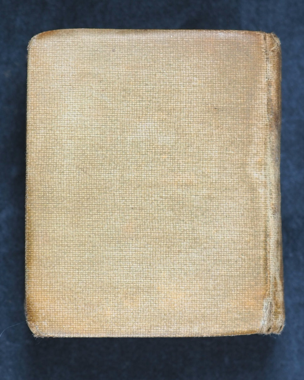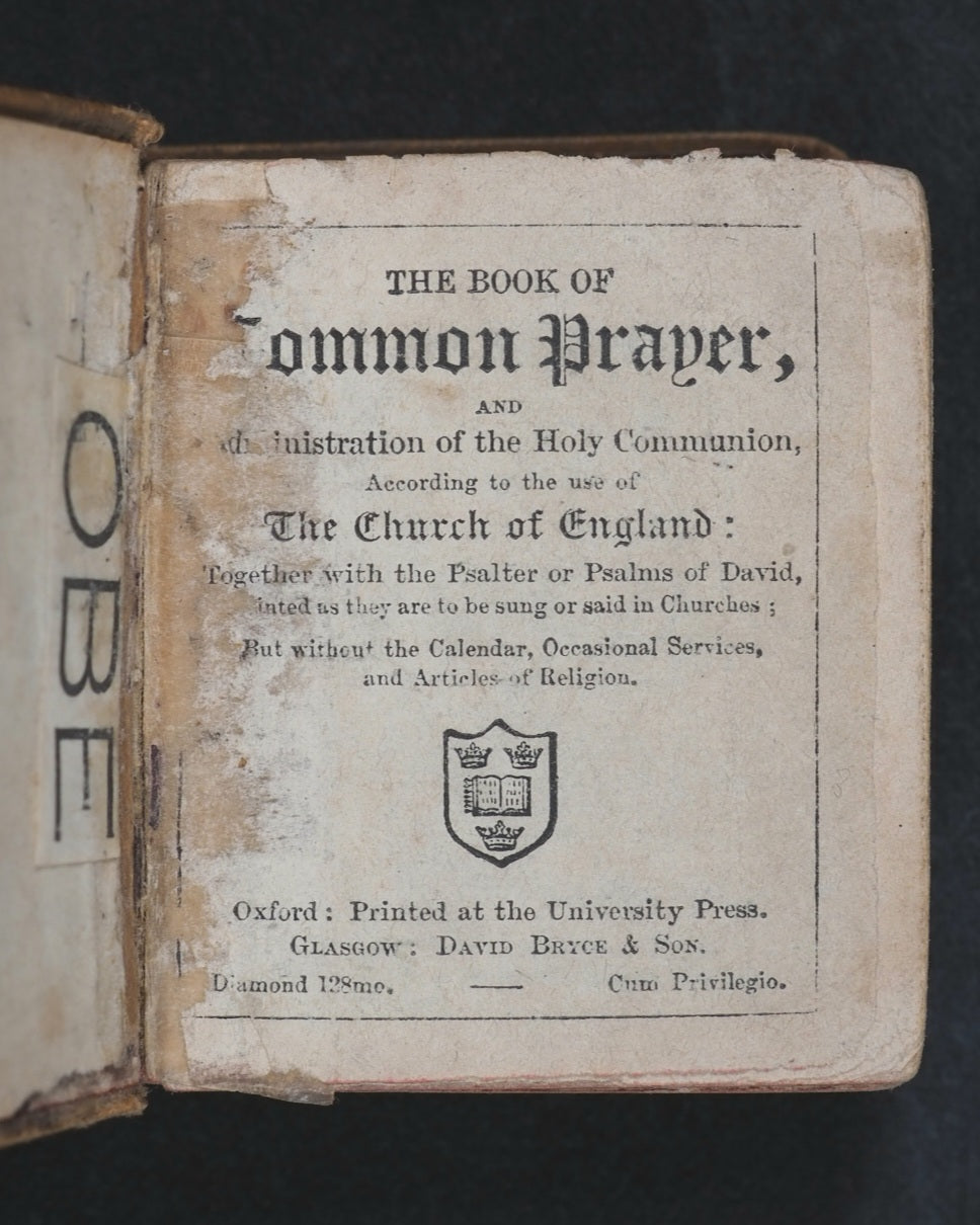 Thumb Book of common prayer and administration of the holy communion : according to the use of the Church of England: Together with the Psalter of Psalms of David, pointed as they are to be sung or said in churches ; But without the calendar, occasional services, and Articles of religion. Diamond 128 mo. 576 pages. Printed at the University Press, Oxford. Signatures: A-S¹⁶. Title page slightly frayed at edges and with slight damage in the gutter. All edges red. Original brown endpapers. 45 x 55 mm. Original tan cloth. Spine with gilt blocked title within gilt circle. Upper cover with black printed crletic cross and blocked title within black borders. Rather worn at hinges. Front inner hinge split with old crude tape repair. Bondy, 105. Garbett, 16. Welsh, 6713. Welsh notes one copy from 1928 Sotheran's Catalogue at 7s 6d. According to Garbett, the only miniature two Bryce publications that predate this title are the Thumb Dictionary, and the Thumb Book of Bible Promises. OCLC, 743326905. WorldCat locates two copies worldwide (University Libraries of Virginia, and Indiana).
