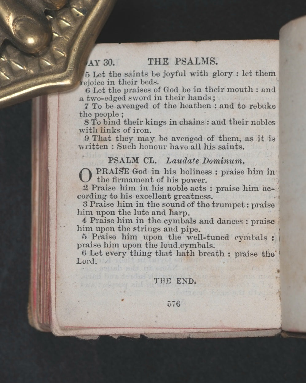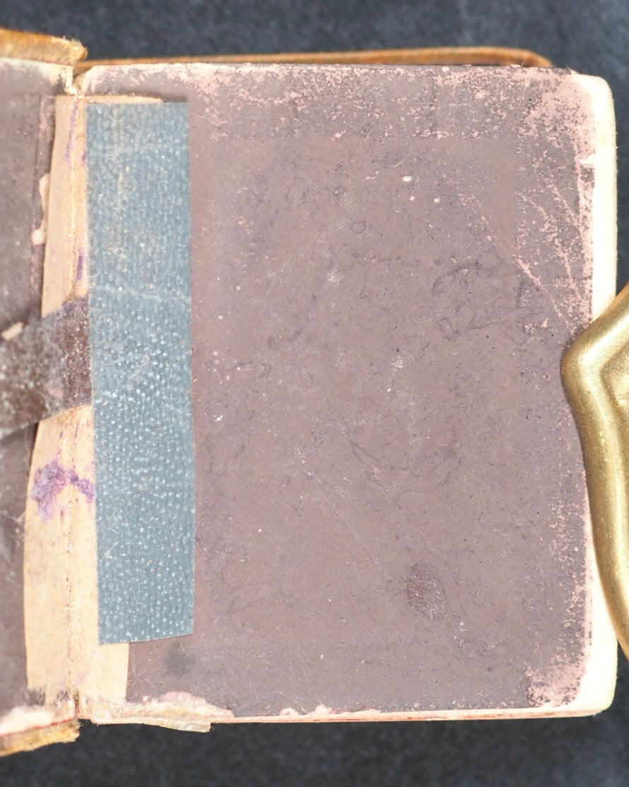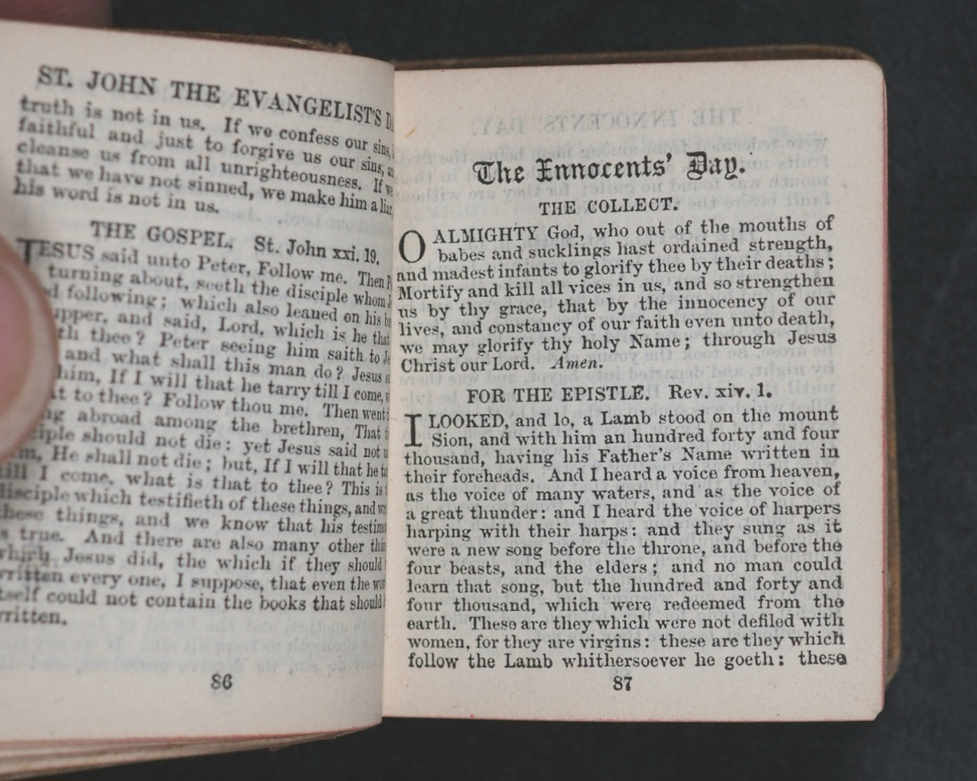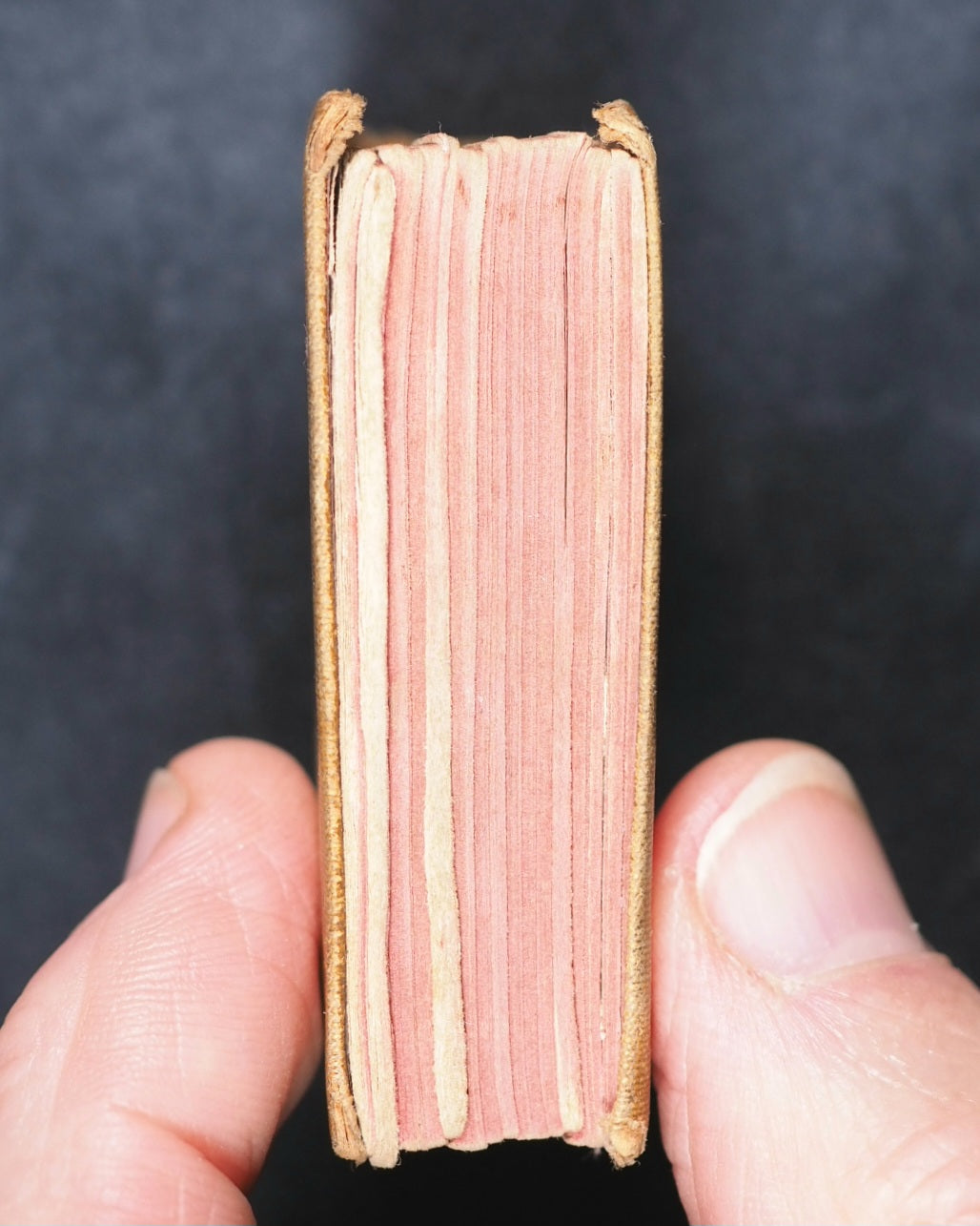 Thumb Book of common prayer and administration of the holy communion : according to the use of the Church of England: Together with the Psalter of Psalms of David, pointed as they are to be sung or said in churches ; But without the calendar, occasional services, and Articles of religion. Diamond 128 mo. 576 pages. Printed at the University Press, Oxford. Signatures: A-S¹⁶. Title page slightly frayed at edges and with slight damage in the gutter. All edges red. Original brown endpapers. 45 x 55 mm. Original tan cloth. Spine with gilt blocked title within gilt circle. Upper cover with black printed crletic cross and blocked title within black borders. Rather worn at hinges. Front inner hinge split with old crude tape repair. Bondy, 105. Garbett, 16. Welsh, 6713. Welsh notes one copy from 1928 Sotheran's Catalogue at 7s 6d. According to Garbett, the only miniature two Bryce publications that predate this title are the Thumb Dictionary, and the Thumb Book of Bible Promises. OCLC, 743326905. WorldCat locates two copies worldwide (University Libraries of Virginia, and Indiana).
